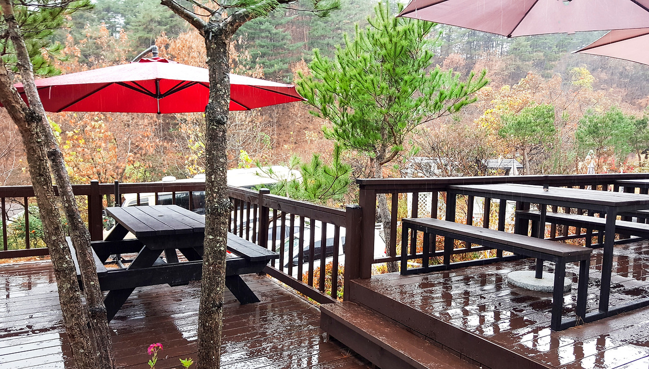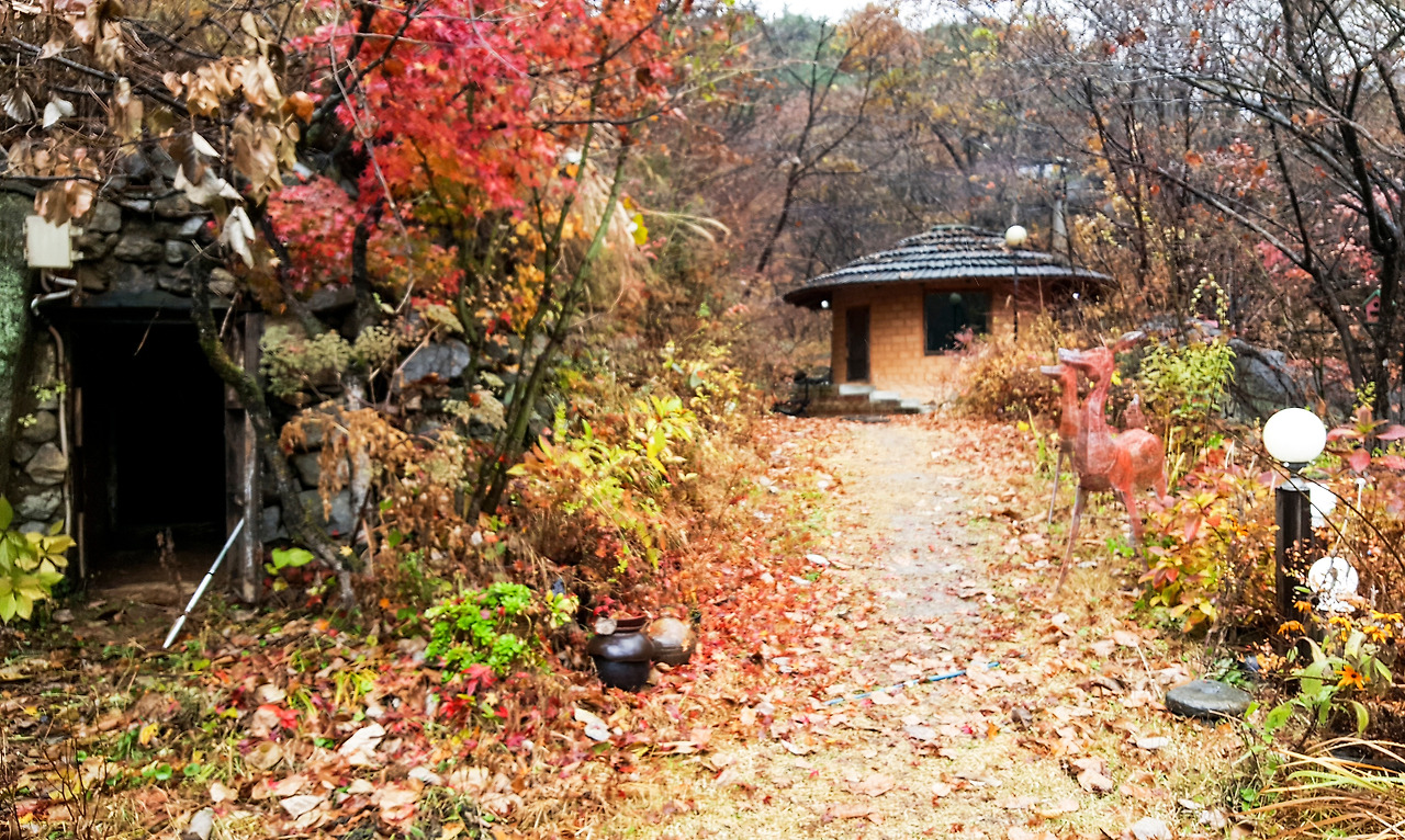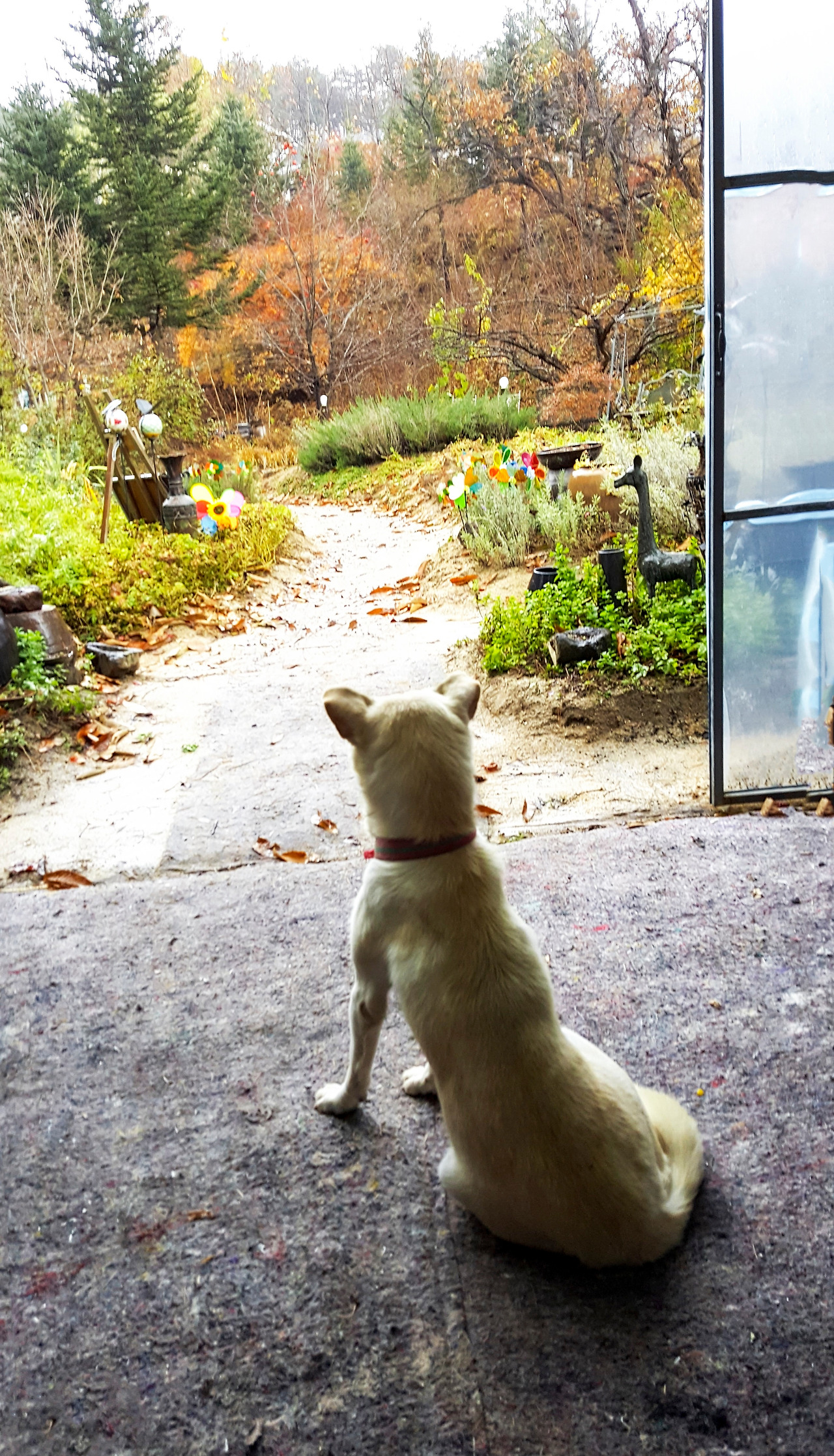 '들꽃편지'에 도착했을 때는 기다린 듯 마구 쏟아지기 시작해서 자동차에서 내려 막 뛰었다. 그렇게 실내에 드니 비 내리는 창 밖의 풍경이 평화로워서 그냥 내다보기만 해도 좋았다. 그런데도 가을 속에 푹 잠긴 들꽃편지 마을의 촉촉한 풍경을 직접 다가가 보고 싶어 빗속으로 나갔다. 비를 맞으며 이리저리 다니며 사진도 찍고 구경하느라 우산이 뒤집히고 머리가 흠뻑 젖기도 했지만 마냥 즐겁기만 한 시간이었다.