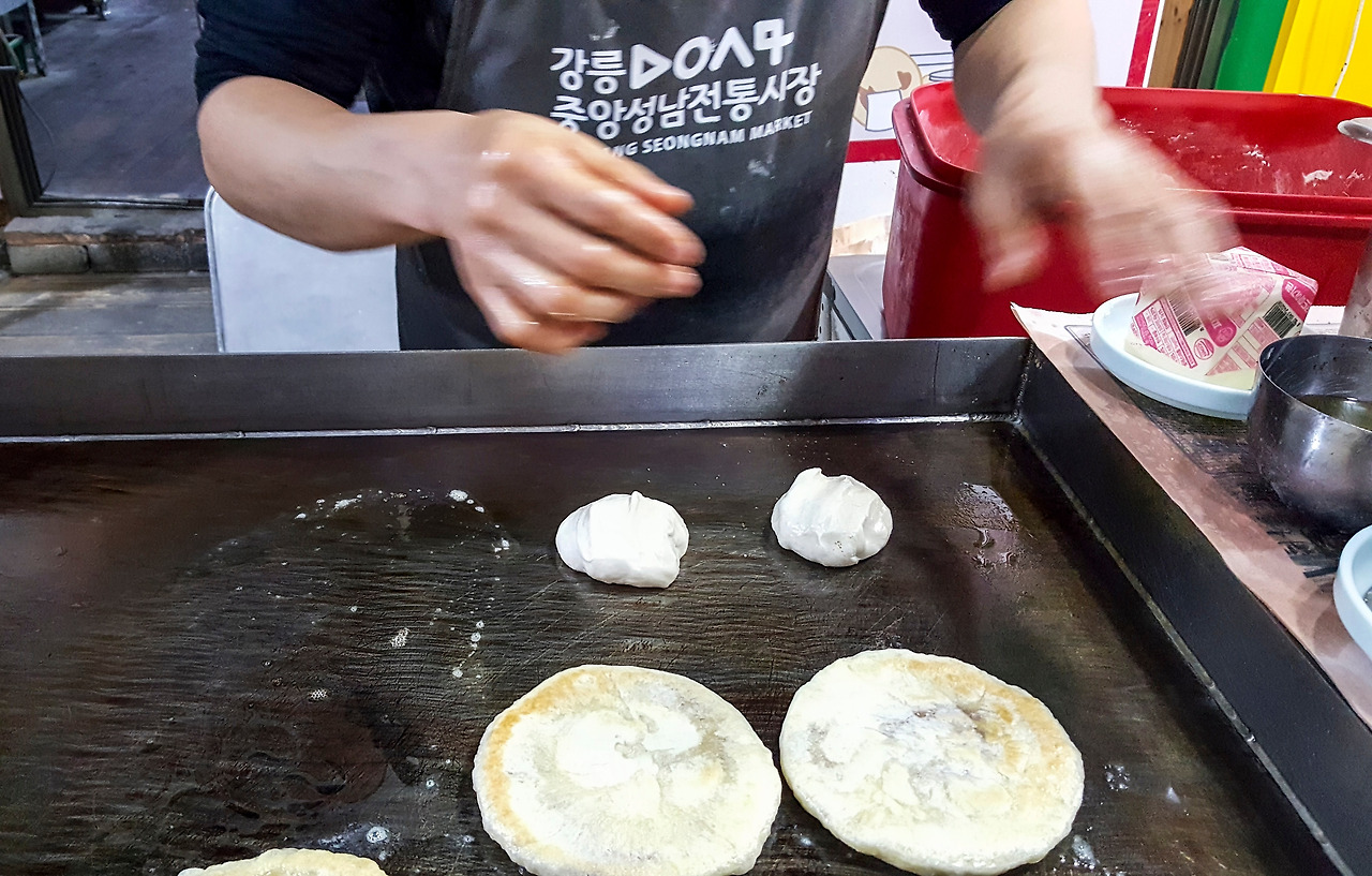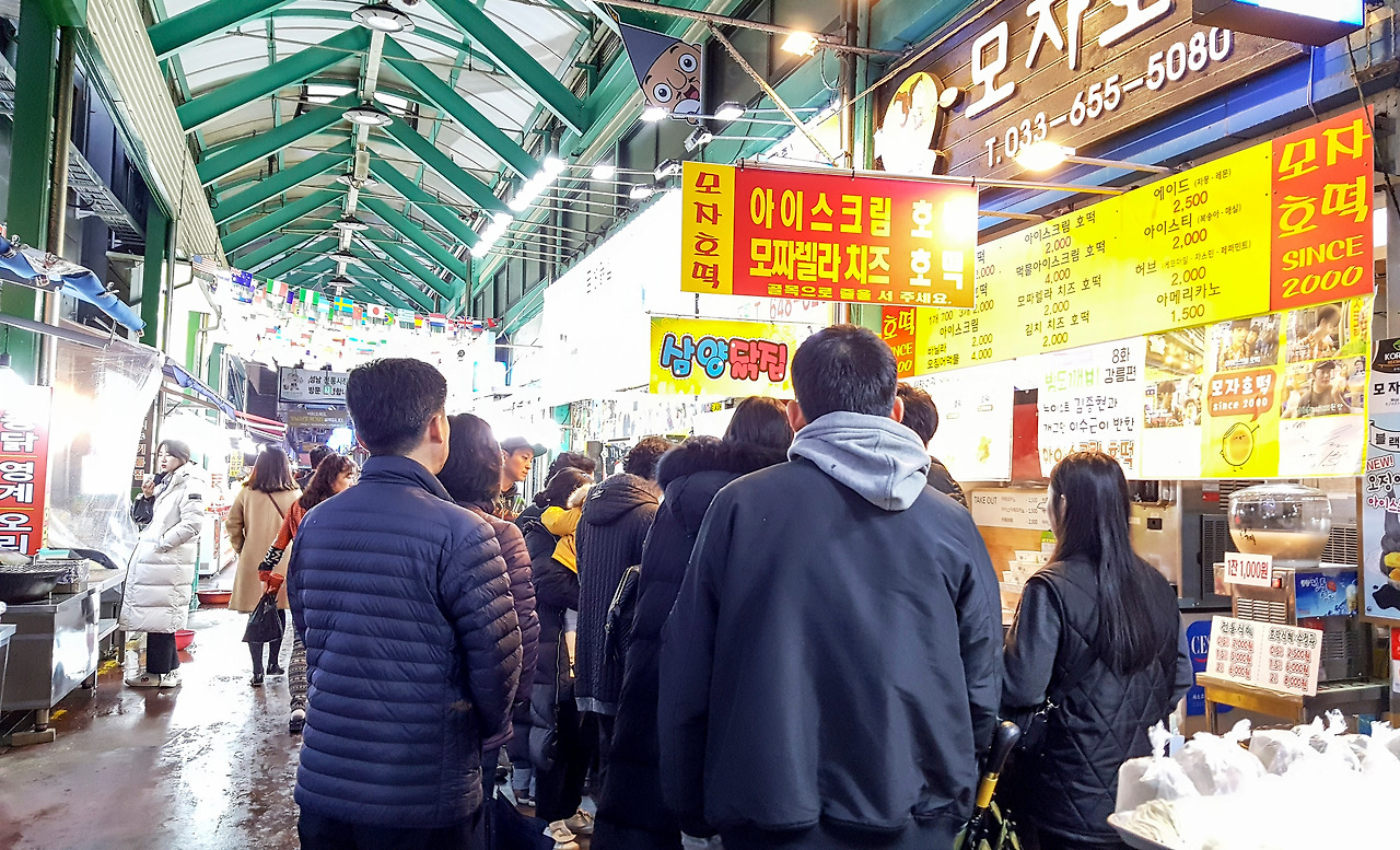 강릉중앙시장에는 매스컴을 통해 이미 유명해진 아이스크림 호떡과 치즈 호떡으로 줄을 길게 서 있다. 맛집들이 즐비하다. 마늘빵과 닭강정 역시 인기여서 사람들이 찾아들고 있다.
