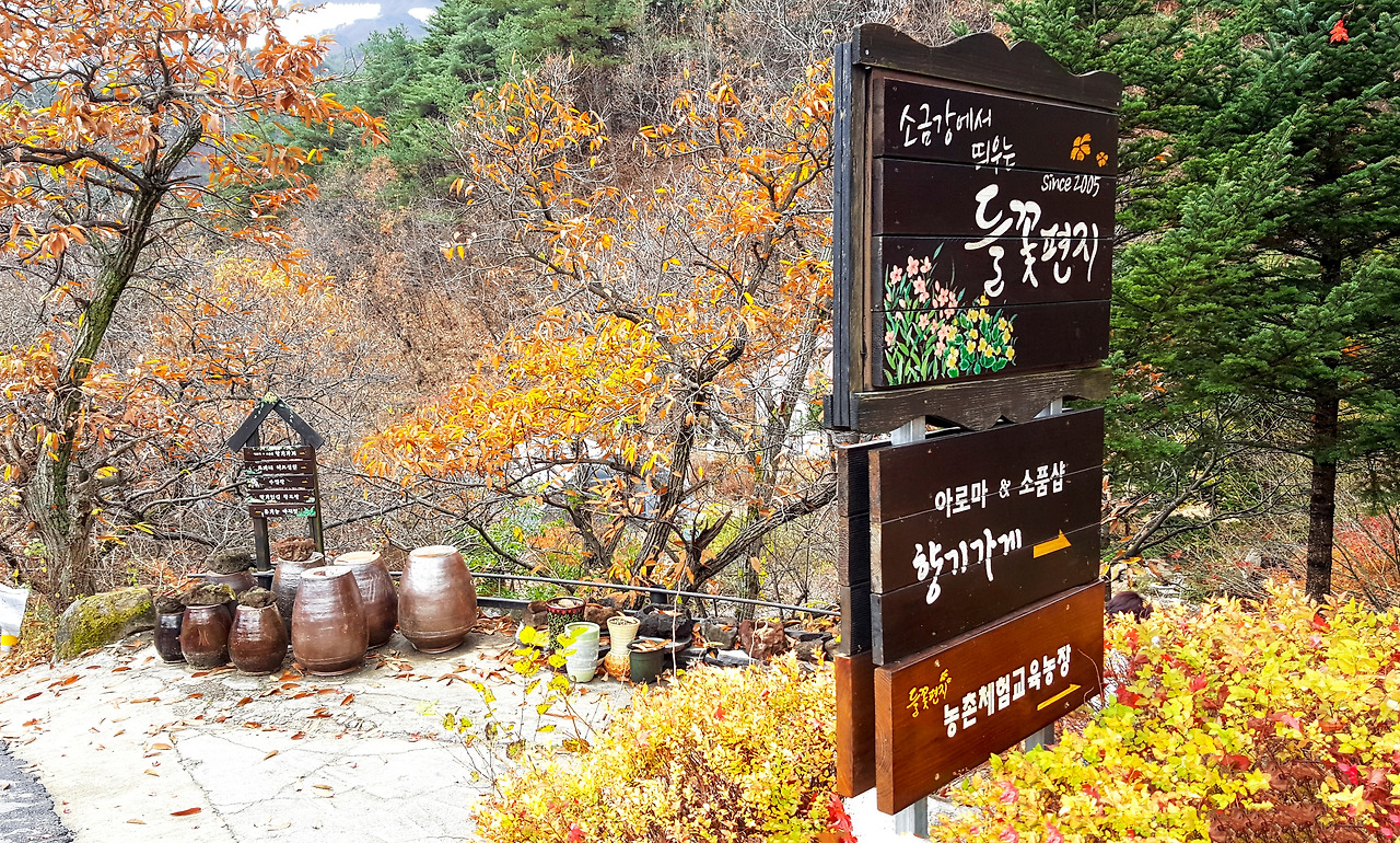 수학교사였던 두 부부가 강원도 산골에 터를 잡아 조경을 하고 꽃 심는 일에 빠져 살다가 이처럼 멋진 산속의 삶을 살게 되었다. 지금은 허브정원과 야생화 계곡 사이로 흐르는 물소리를 들으며 자연 속에서 유유자적 사는 듯하다. 그러나 정작 들어가 보면 조용한 카페가 있고, 향기 테라피 가게, 아름다운 펜션, 계곡 옆의 황토방, 들꽃편지 체험농장 등이 있어서 결코 한가롭지만은 않을 듯싶다.