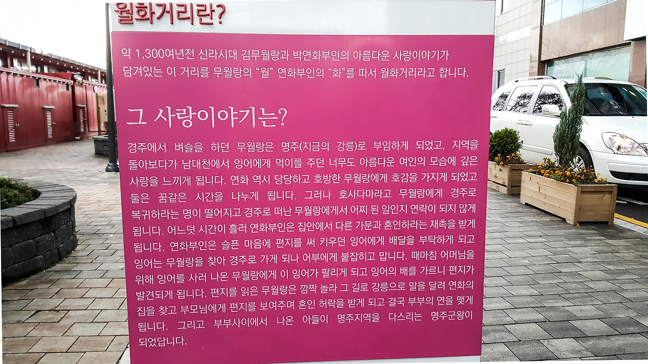 - 강릉 월화정 설화를 바탕으로 만든 월화 거리의 이야기.