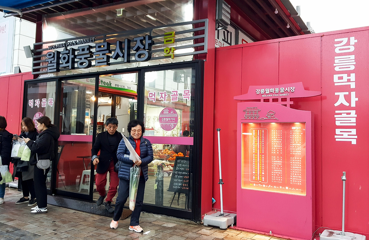 강릉의 새로운 명소로 떠오르고 있는 교동의 ‘월화 거리’는 강릉 도심을 지나던 폐철도 부지에 조성된 공원시설이다. KTX 강릉선 개통으로 강릉 도심 철도가 지하화 되면 옛 지상 철길은 유휴지로 남게 됐다. 강릉시는 더 이상 기차가 달리지 않게 된 이 공간을 공원화했다. 컨테이너로 이루어진 월화 풍물시장은 기존에 있던 시장을 리모델링해서 만들어졌다. 강원도의 메밀전병이나 감자떡 등의 토속음식들은 물론이고 다양한 간식거리로 옛 분위기를 느끼며 즐길 수 있는 곳이다.