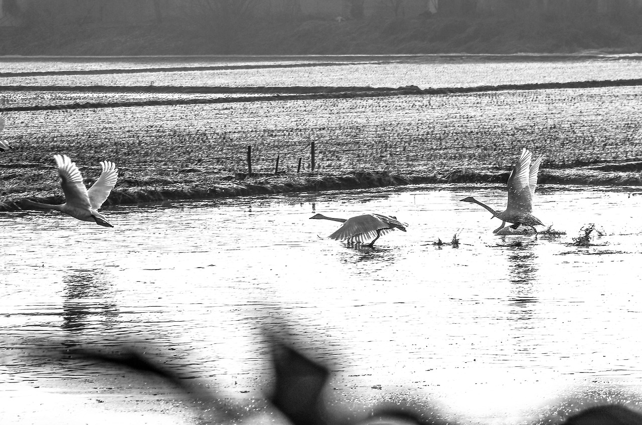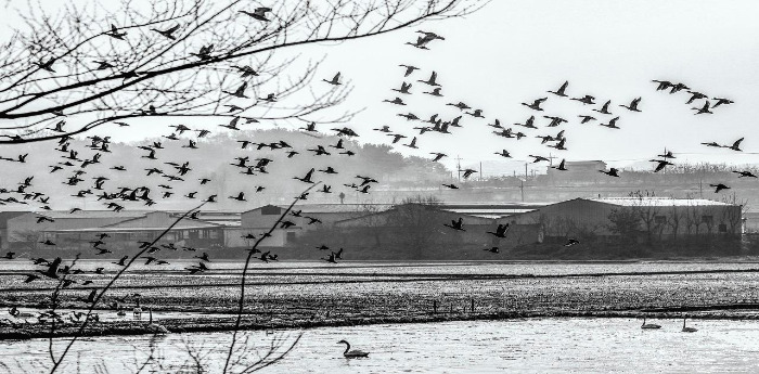 물논에 큰기러기들이 먹이를 쪼으며 조금씩 움직이고 있다. 간간히 두루미가 살짝 날갯짓을 한다. 큰 고니의 도움닫기도 구경하고 휴식을 취하던 쇠기러기는 가끔씩 고개 숙여 물속에서 먹이를 찾는 모습이다. 노을 무렵 떼 지어 날아가는 웅장하고 거대한 새떼의 모습은 볼 수 없으나 군데군데 다정하게 무리 지어 있는 아침 풍경이 평화롭다.