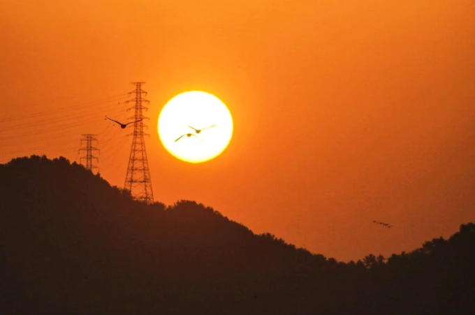 건너편 산등성이 너머로 하늘에 조금씩 붉은빛이 번진다.