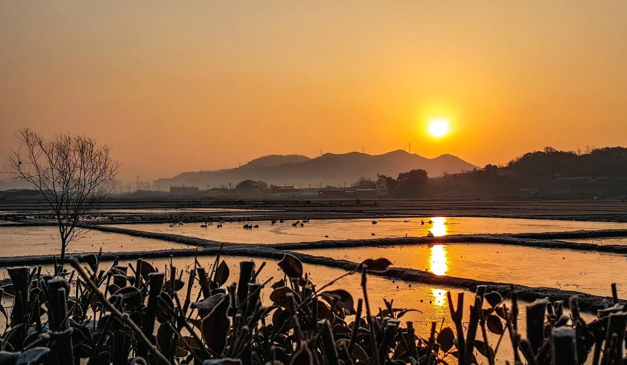 그리고 빠르게 아침해가 고개를 내밀기 시작한다. 새벽이 열리는 붉은 하늘에 무리 지어 나는 철새들의 비행이 여유롭다. 물논에서 노닐던 원앙과 백로가 아침해를 받아 붉은 반영 속에 잠겨있다. 말 그대로 철새들의 낙원이다. 온 산하가 일출의 붉은 기운을 받아 가슴 벅차게 설렘을 준다. 한바탕 일출의 잔치를 즐기고 나면 행복해진다.