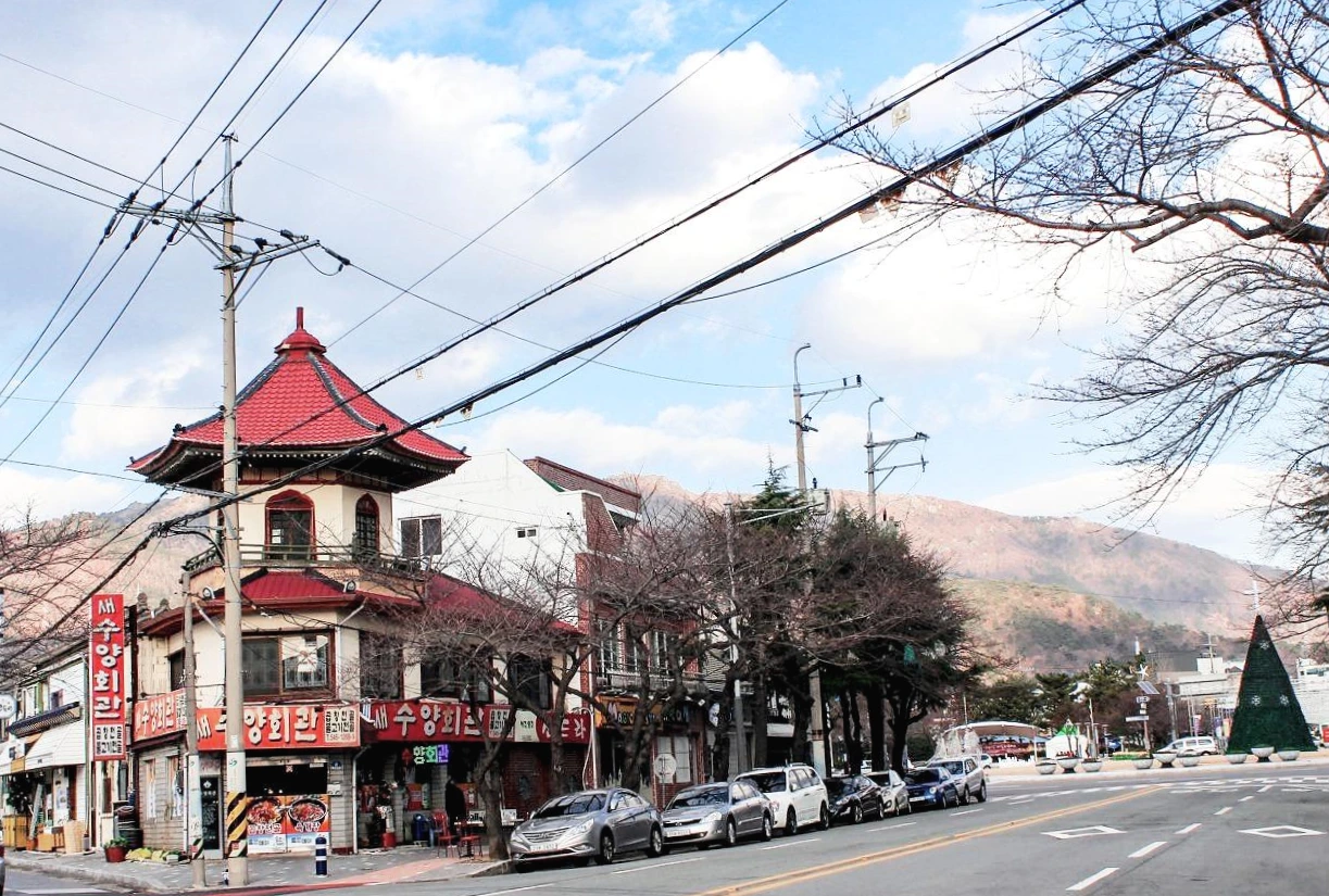 건너편에는 <육각 지붕의 뾰족집> 수양회관이 보인다. 중국풍의 팔각 누각이다. 일제 강점기에 일본군 초소와 요정으로 사용된 곳인데 지금도 음식점으로 운영되고 있다.