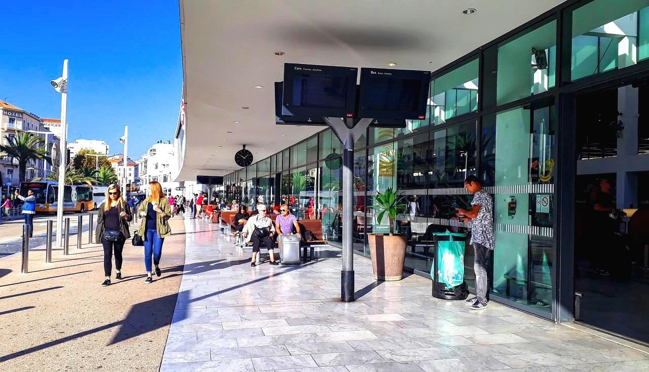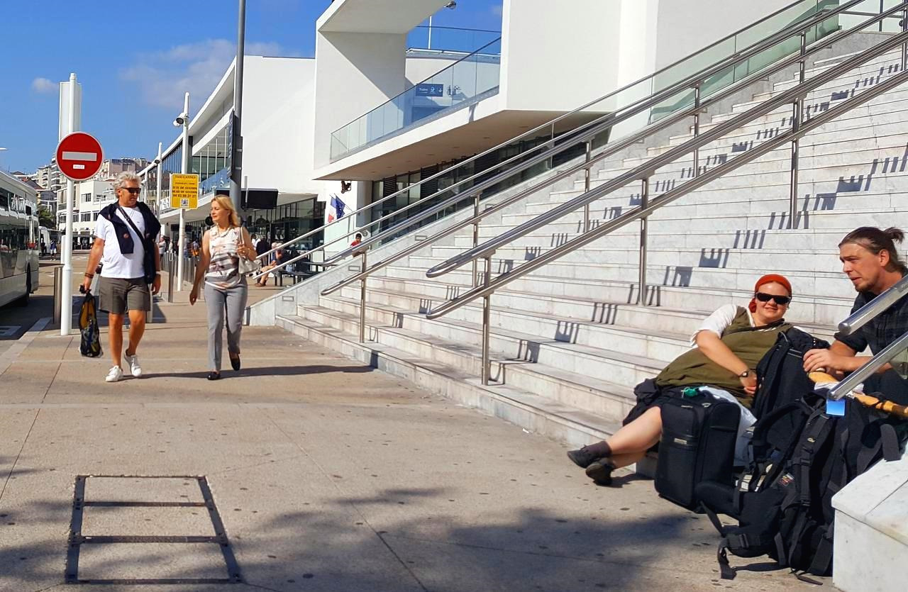 아침햇살이 쏟아지는 칸느역에 오가는 사람들.