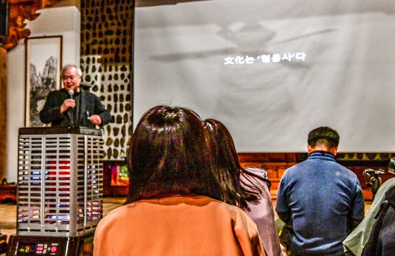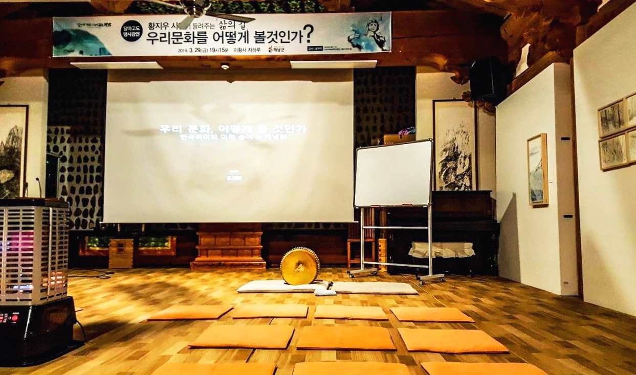 미황사 템플스테이의 첫 번째 일정은 저녁 공양후 남도문화의 체험이다. 구수한 남도 소리를 바로 눈앞에서 들으며 함께 추임새도 넣어본다. 이어서 황지우 시인이 들려주는 삶의 길, 우리 문화를 어떻게 볼 것인가에 대한 이야기를 듣던 산사의 밤이었다.