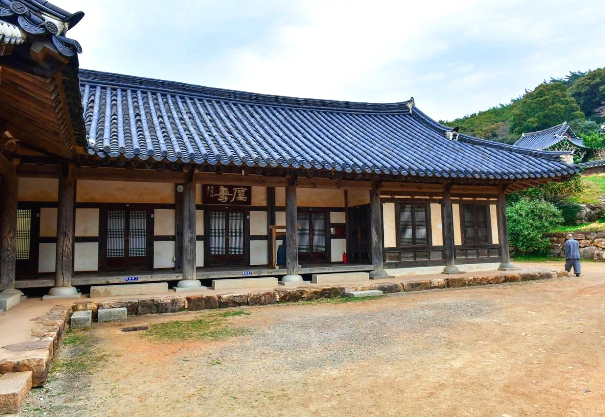 절 입구부터 위로 올려다보면서 한참을 걸어서 오른 미황사는 산에 스며있는 절이라는 인상을 준다. 산을 다듬어서 평지에 지어진 모습이 아니다. 산의 높이에 그대로 맞추어 각각 앉혀졌다. 건물마다 비탈길이나 계단으로 오르내려야 하는 높낮이가 있다. 그래서 아래서 올려다보는 절의 처마나 기둥, 그리고 바람에 흔들리며 소리내는 풍경소리가 남다르다. 산이 감싸 안은 안온함도 느껴진다.