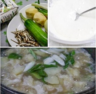 멸치육수가 불 위에서 맹렬히 끓을 때 나붓나붓하게 썬 감자와 연한 애호박을 넣어 한 소큼 끓여줍니다. 그리고 <아주 묽게 해 놓은 밀가루 반죽>을 주걱에 평평히 올린 후 젓가락으로 톡톡 끊듯이 냄비 속으로 투하시키는 겁니다. 대식구가 먹을 양을 하다 보니 엄마의 빠른 손놀림은 가히 달인의 경지였던 것 같습니다. 이 방법은 바쁠 때 스피디하게 할 수 있어서 시간도 절약될 뿐 아니라 수제비 한 점 한 점의 맛이 부드럽고 충분히 익은 감자나 애호박과도 잘 어울리는 맛입니다.
