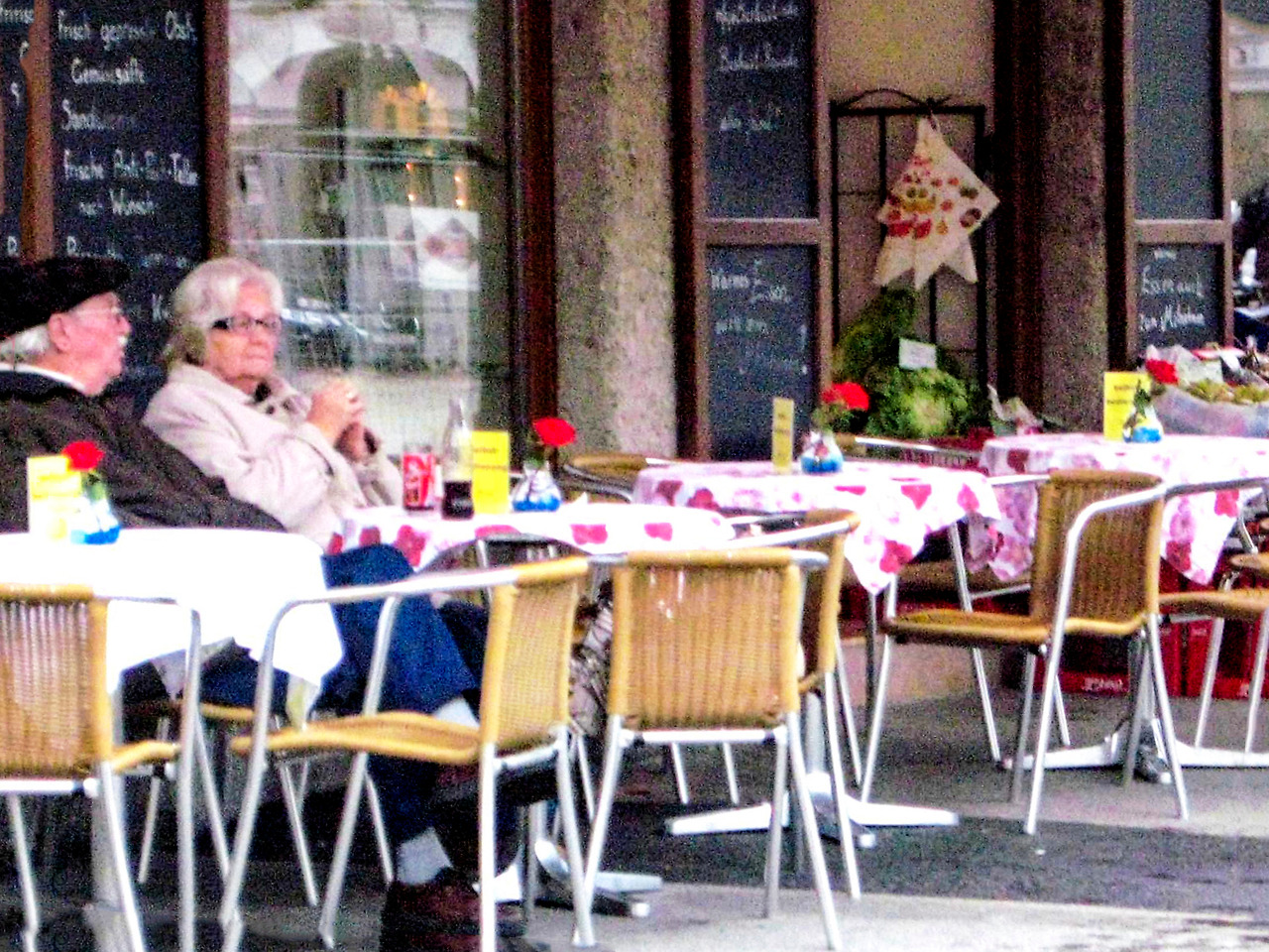 야외 노천카페에 앉아 비 내리는 짤츠의 거리를 바라보는 노부부
