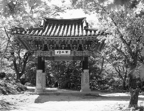 6. 25 전쟁 중 파괴되지 않은 유일한 건축물인 불이문(不二門)이다. 일주문의 기둥은 보통 2개인데 건봉사 일주문은 4개의 기둥이 세워져 있다. 불이문을 지나면 오른쪽에 법당이 있었던 널찍한 절터가 펼쳐진다. 드넓은 터는 전쟁으로 소실되기 전 당시 절의 규모를 짐작할 수 있을 만하다.