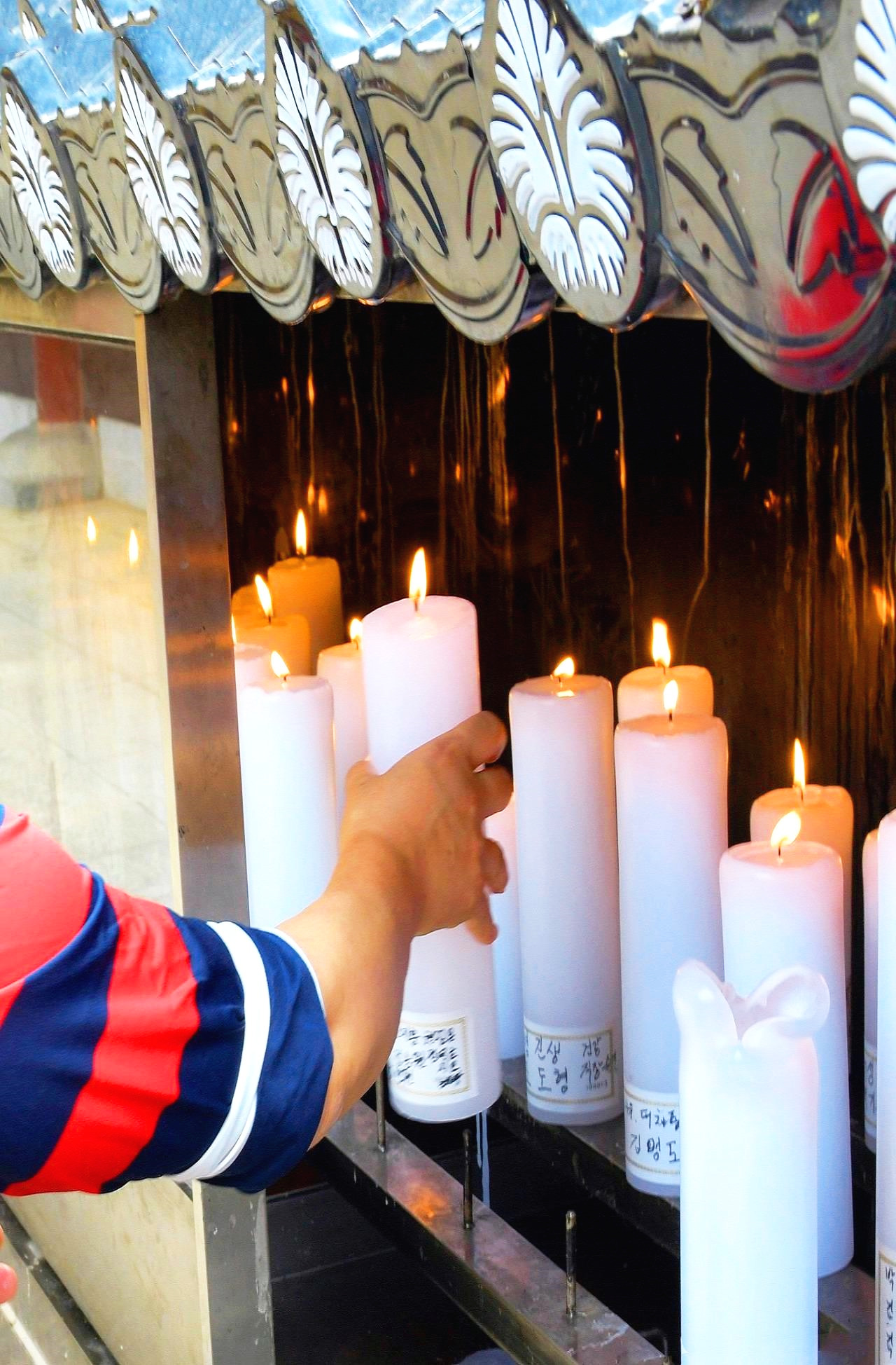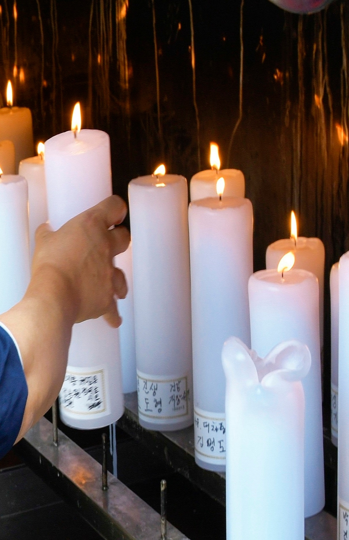 모든 번뇌가 남김없이 소멸되어 고요해진 열반의 상태인 적멸(寂滅)과, 보배같은 궁전이란 보궁(寶宮), 발걸음 소리만 들리는 고요하기만 한 적멸보궁 안을 들여다 보고 뒤편으로 가본다. 부처님의 치아 진신사리를 모신 사리탑을 숲이 감싸고 있다. 그 아래 촛불 기도를 올리는 분이 있어서 나도 기다렸다가 초를 하나 사서 마음을 담아 촛불 공양을 했다. 이런 사소하고 어설픈 짓이 괜히 위안이 되는 가엾은 중생...