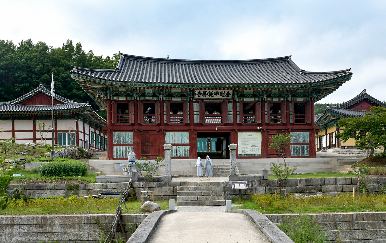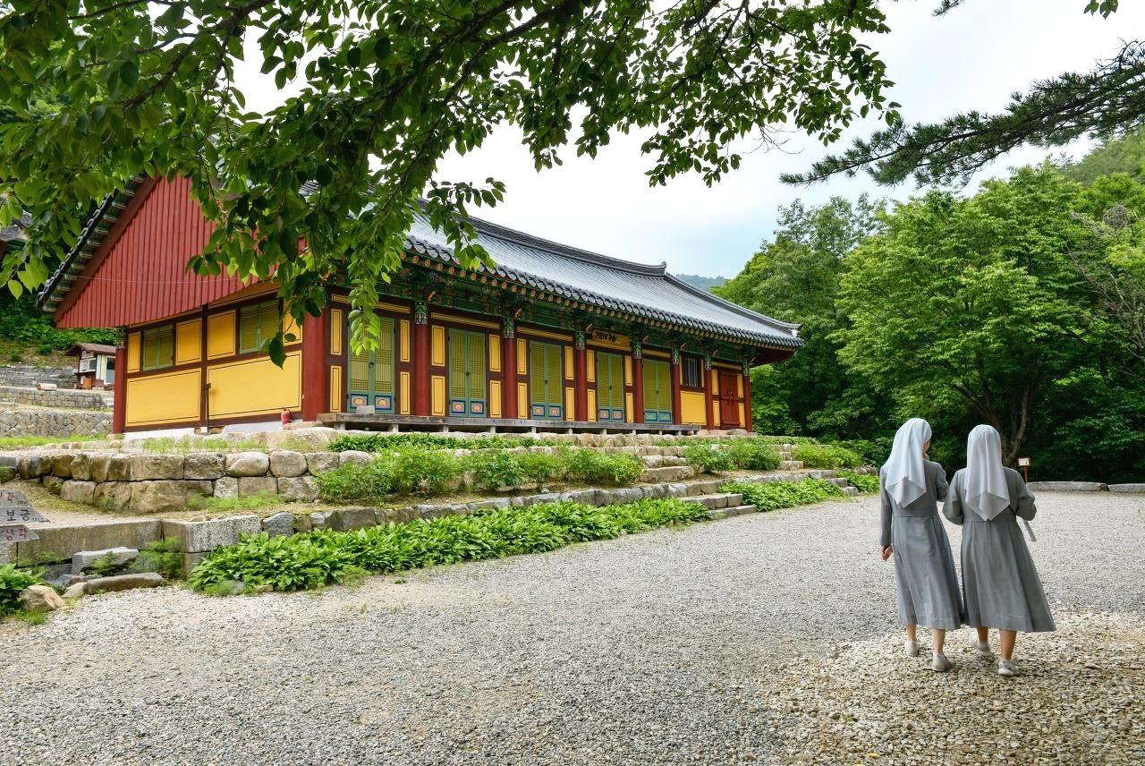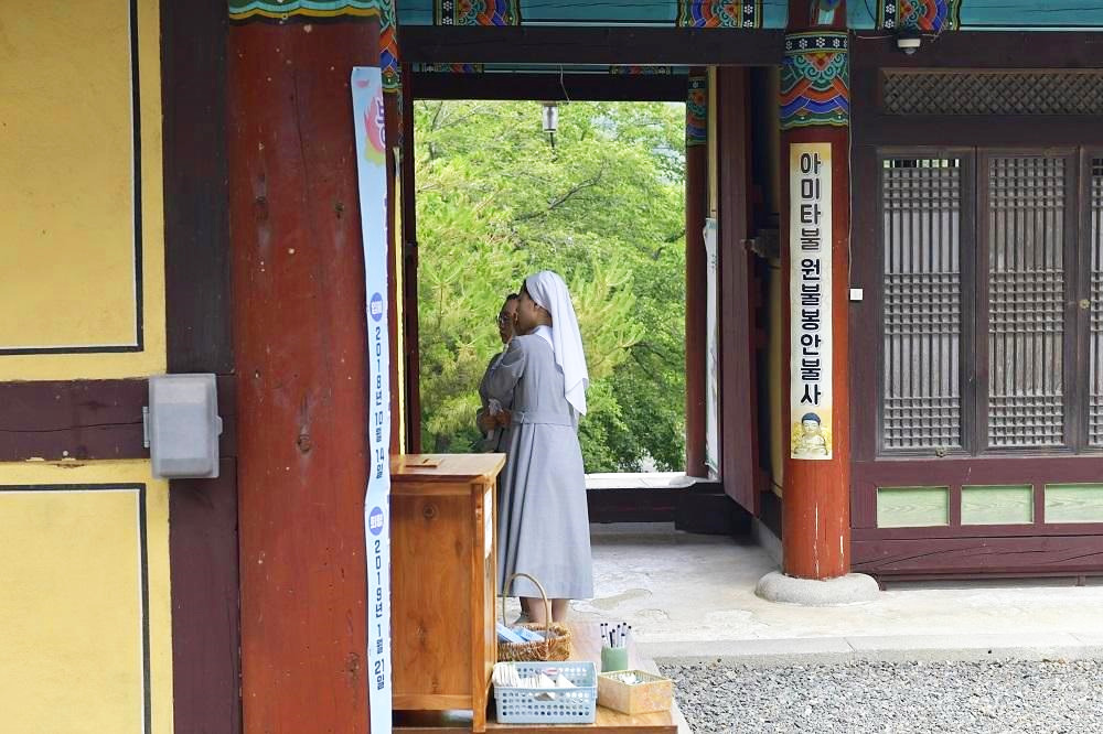같이 갔던 일행들은 능파교를 건너 대웅전엘 먼저 갔지만 나는 적멸보궁 쪽으로 향했다. 사람들이 적을 때 먼저 조용히 보고 싶었다. 돌계단을 오르고 어리연이 뒤덮은 양쪽의 연못에 뙤약볕이 쏟아지고 있다. 마침 앞서 가던 두 분의 수녀님이 샘가에서 물을 마시고 있다. 조용조용히 이야기를 나누며 사찰의 이곳저곳 꼼꼼히 살펴보는 수녀님의 뒷모습이 어쩐지 보기 좋다.