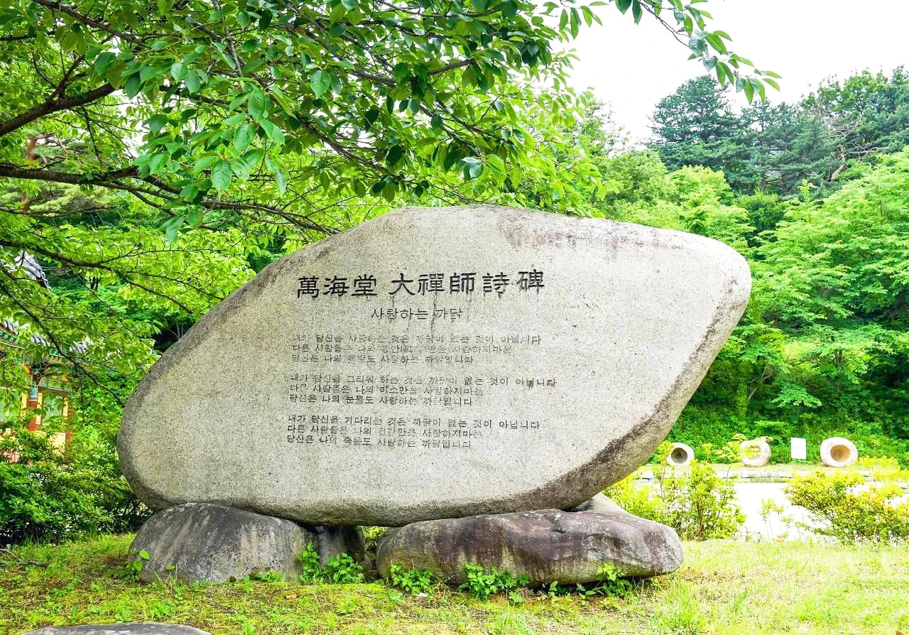 여름이 한창인 강원도 고성의 건봉사 가는 길은 생각보다 한적하다. 오는 길에 라벤더 꽃밭을 보고 왔는데 그 화사해진 마음을 지긋하게 눌러주는 힘이 전해진다. 입구 마당의 사명대사와 한용운 님을 기리는 기념관을 둘러보고 그 옆의 '사랑하는 까닭'이라는 한용운 님의 시비를 들여다본다. "내가 당신을 사랑하는 것은 까닭이 없는 것이 아닙니다......"