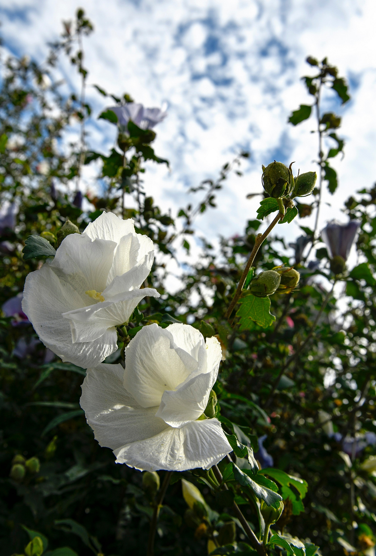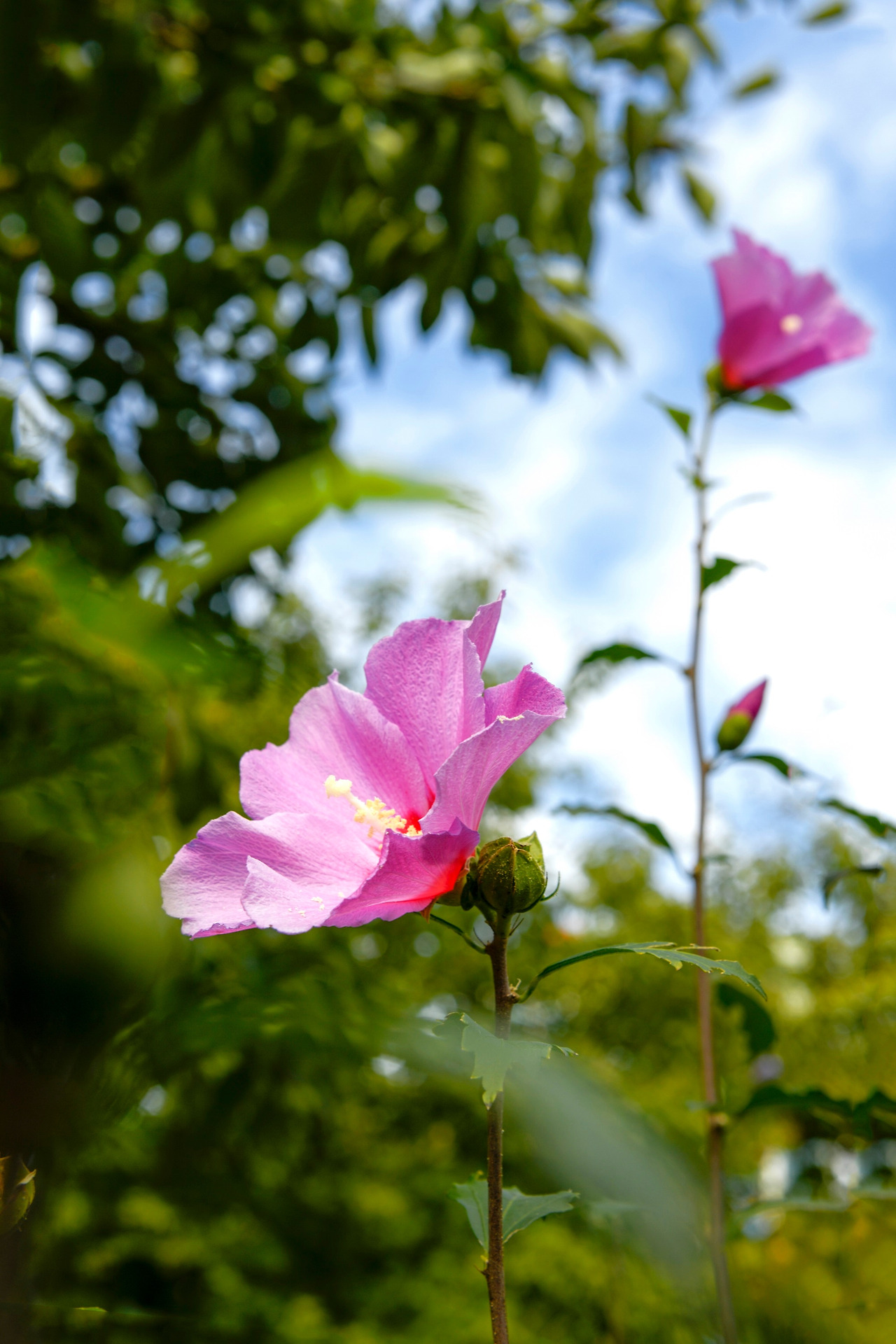 보라매 공원에 초가을의 푸른 하늘을 배경으로 무궁화 꽃이 피었습니다.