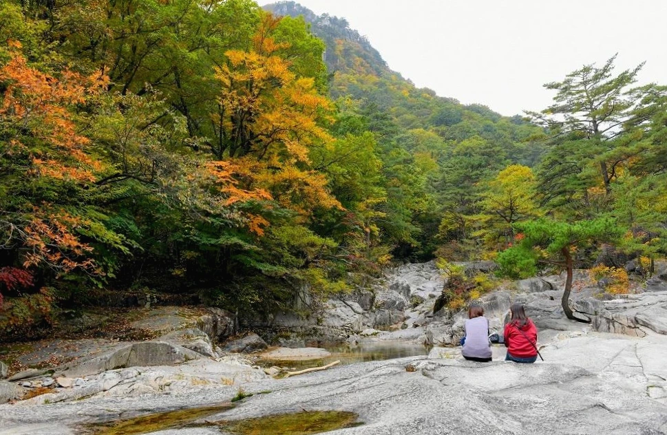 학소대와 옥류동 계곡, 장군바위, 병풍바위, 몇 번의 계단과 흙돌 길, 선녀탕을 지나면 나타나는 쌍폭(雙瀑)과 용추폭포(龍湫瀑布)에 다다르기 위해 사람들은 걷는다. 볼거리의 하이라이트는 이렇게 마지막에 있다지만 오르면서 이 멋진 계절의 자연 속에 풍덩 빠져있다는 걸 아는 순간을 느낀다면 성공적인 여행이 아닐지. 가을날의 호사가 따로 없다.