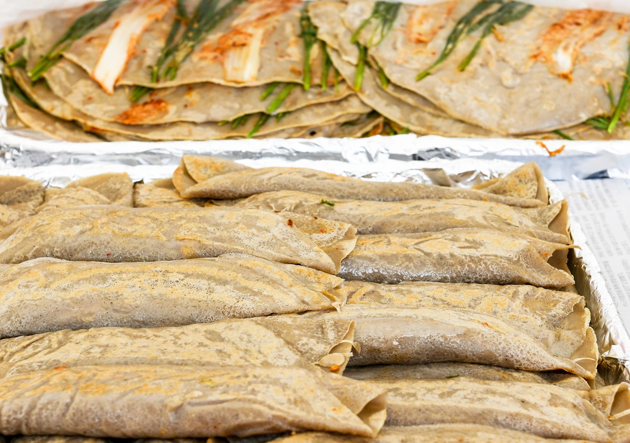 시장에 왔으면 사방에 널린 먹거리 한 두 개쯤 사서 먹으며 다녀야 제 맛이다. 막 튀겨내는 도넛도 있고 떡이 만들어지고 김이 무럭무럭 오르는 만두도 있다. 강원도 먹거리 메밀전병이나 노란 강냉이 막걸리는 구경꾼의 발걸음을 멈추게 한다.