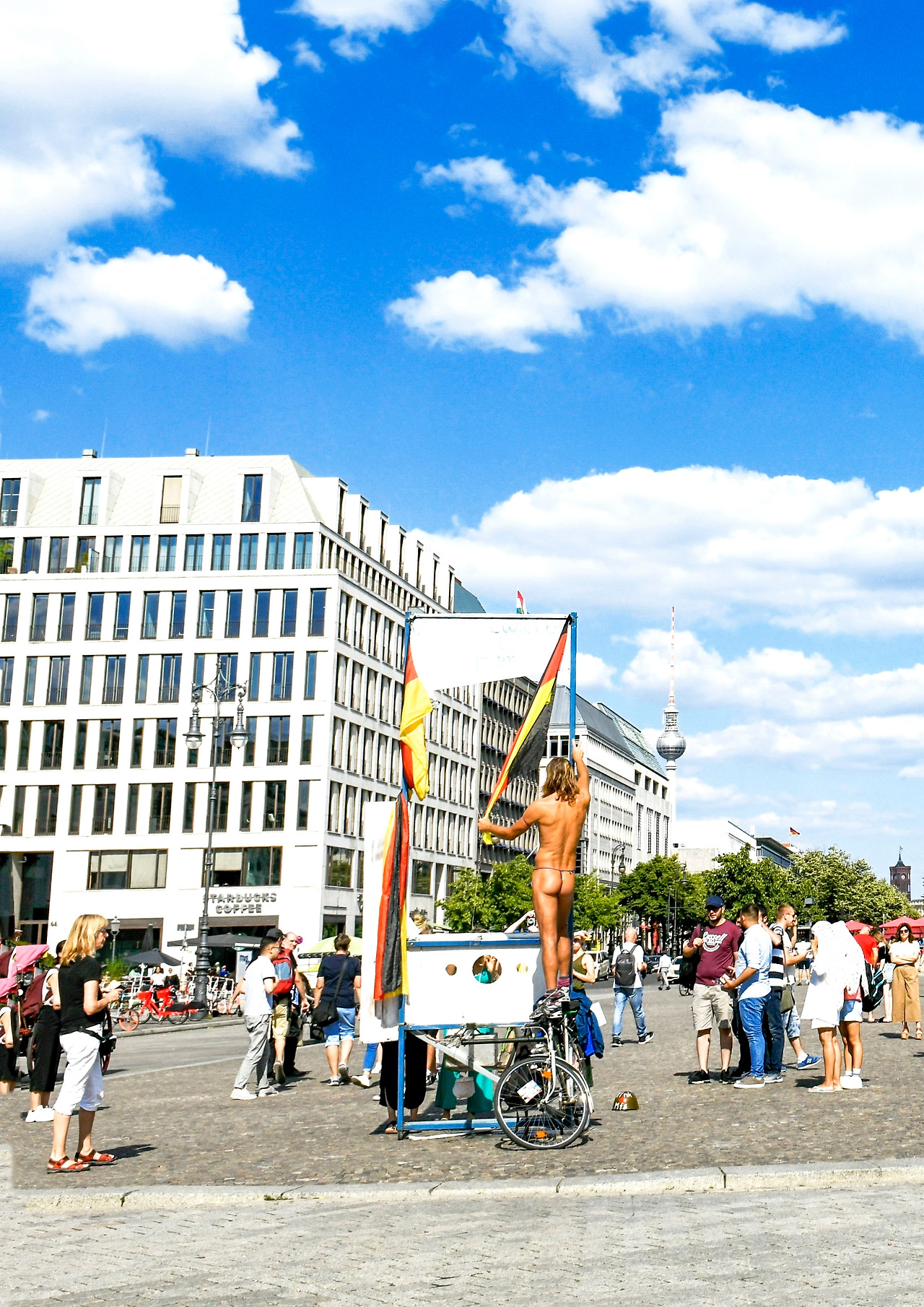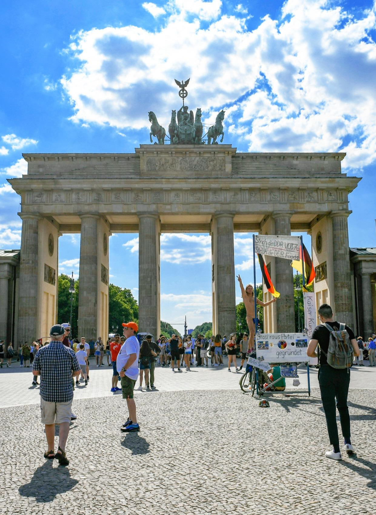 광장에서 멀리 서서 바라보았다. 다가갈 생각 없이 광장 복판에서 어슬렁거렸다. 무엇을 탐색하듯 연구하듯 들여다 본들 우리가 아는 브란덴부르크문 아닌가. 누구나 눈도장 찍는 곳이란 생각에 심드렁하게 바라보며 걷는데 눈에 들어오는 남자, 앗, 옷을 입은 건가? 입었다. 나뭇잎파리로 앞부분만 가리듯 끈으로 손바닥만 한 푸른 천을 매달아 앞부분을 가렸지만 가끔씩 바람에 펄럭였다.