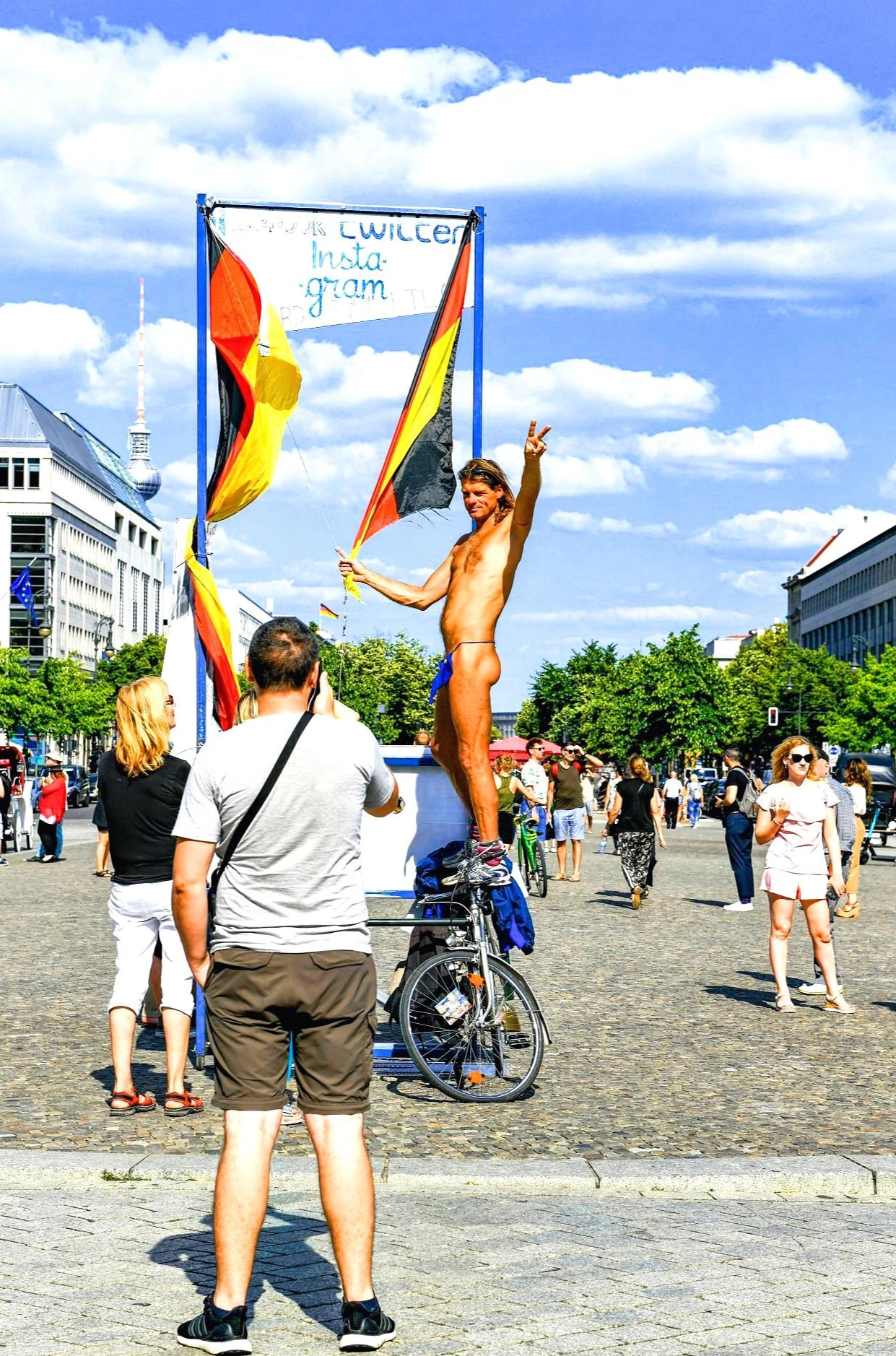 도대체 뭐 하자는 거지? 조금 다가가 보니 깃발 같은 표지판에 독일 국기와 함께 페이스북, 트위터, 인스타그램의 주소를 적어놓은 게 보인다. 팔로우 수를 늘리려는 건지 아니면 sns에 자신을 띄우라는 건지 뜨거운 태양 아래서 참 애쓴다 싶다. 처음엔 다가가기 주춤거렸지만 조금 지나니 어서 찍으시오 하는듯한 그를 향해 별것 아닌 듯 마구 셔터를 누르고 있는 나를 본다. 하긴 아주 가까이 가서 들여다보며 그 남자와 이야기를 나누는 여자들도 있는데 뭘.