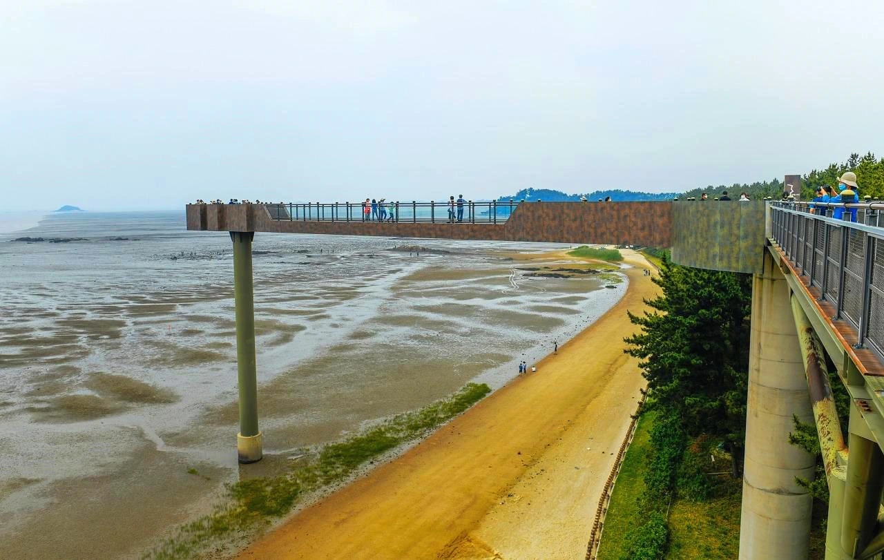 해솔 밭 산책길을 따라가다 보면 그 끝에 기벌포 장항 스카이워크 전망대가 있다. 체온 체크와 손 소독 후에 오른 스카이워크는 발아래가 훤히 다 보이는 강화유리가 아니어서 겁날 일은 없다. 그러나 15m의 높은 상공에서 시원한 바닷바람을 맞으며 상쾌한 시간 속에 서는 것은 멋진 일이다.