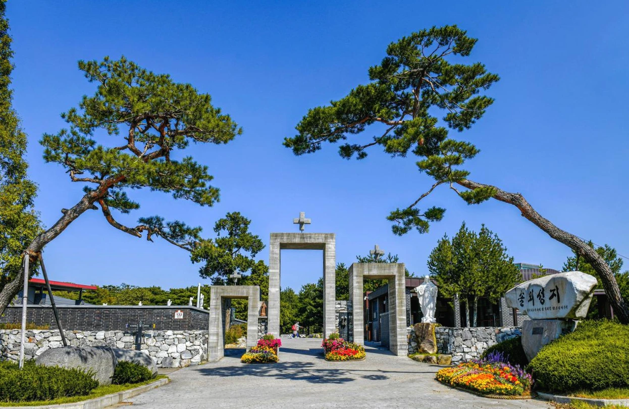 솔뫼 성당 입구를 들어서 조금 걸으면 원형 공연장 겸 야외 성당인 솔뫼 아레나가 쉼터처럼 펼쳐진다. 둘레에 12 사도가 세워져 있어서 야외행사의 느낌이 남다를 듯하다. 성당 주변을 둘러싼 솔밭 사이로 천주교 박해와 관련 있는 조형물들이 이어진다. 천주교 전파를 위해서 피를 흘린 순교자들의 모습이 노송들 사이에서 성스럽다.