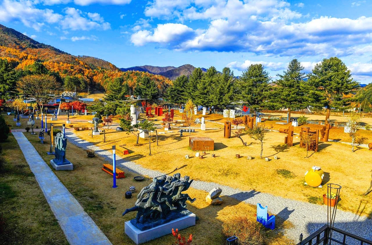 예전엔 운동장이었을 조각공원은 자연이 주는 넉넉함으로 천천히 둘러볼 수 있는 여유를 준다. 잔디 마당은 발걸음마다 부드럽다. 아이들이 조각품 사이에서 뛰어놀고 있는 정경 속에서 엄마 아빠는 예술작품 앞에 서서 이야기 나누는 모습이 그림처럼 아름답다. 가을이 깊어가는 운동장엔 노랗게 빨갛게 물든 단풍잎이 날리고 발아래 낙엽이 바스락거리고 거길 오가는 누구라도 갬성 충만이다.