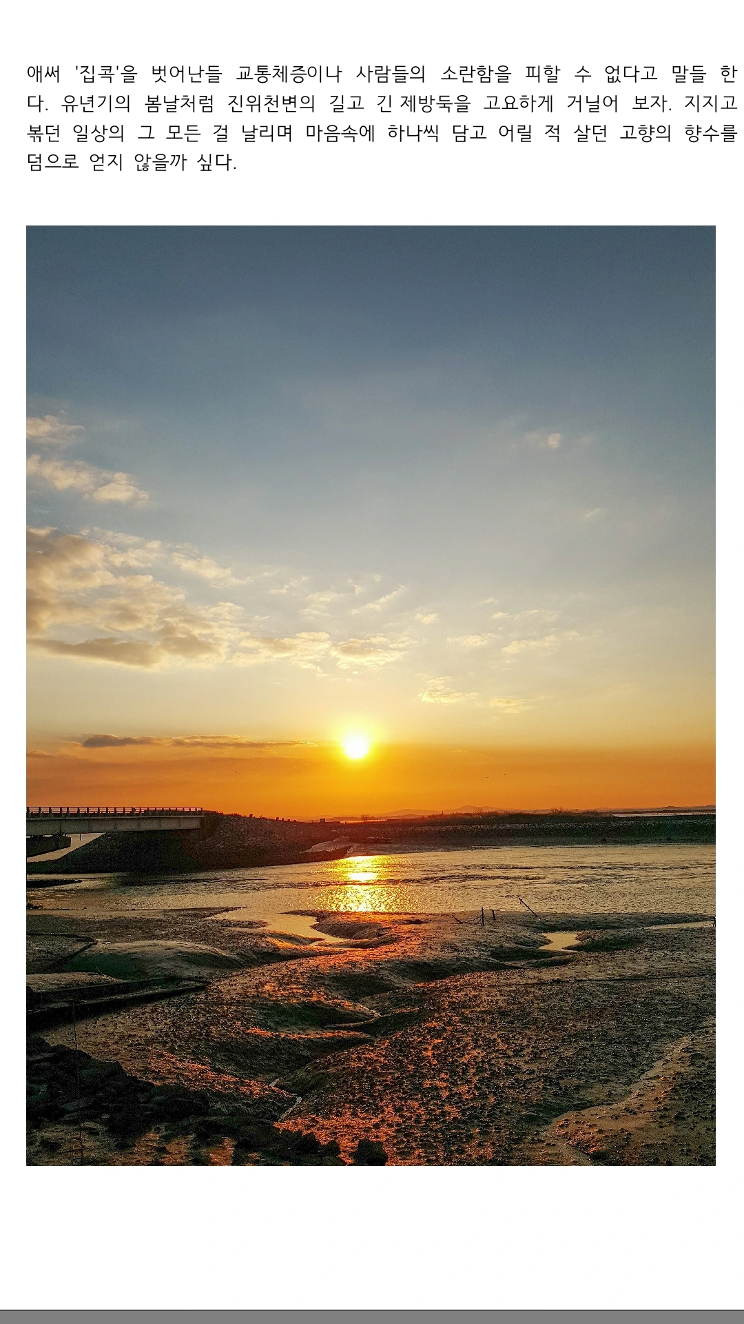 애써 '집콕'을 벗어난들 교통체증이나 사람들의 소란함을 피할 수 없다고 말들 한다. 유년기의 봄날처럼 진위천변의 길고 긴 제방둑을 거닐어 보자. 지지고 볶던 일상의 그 모든 걸 날리며 마음속에 하나씩 담고 어릴 적 살던 고향의 향수를 덤으로 얻지 않을까 싶다.