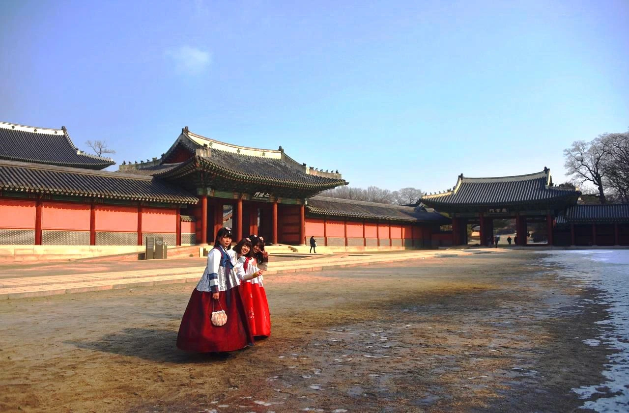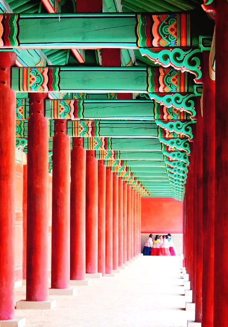 회랑의 즐비한 저 끝에 옹기종이 모여 있는 한복처자들.