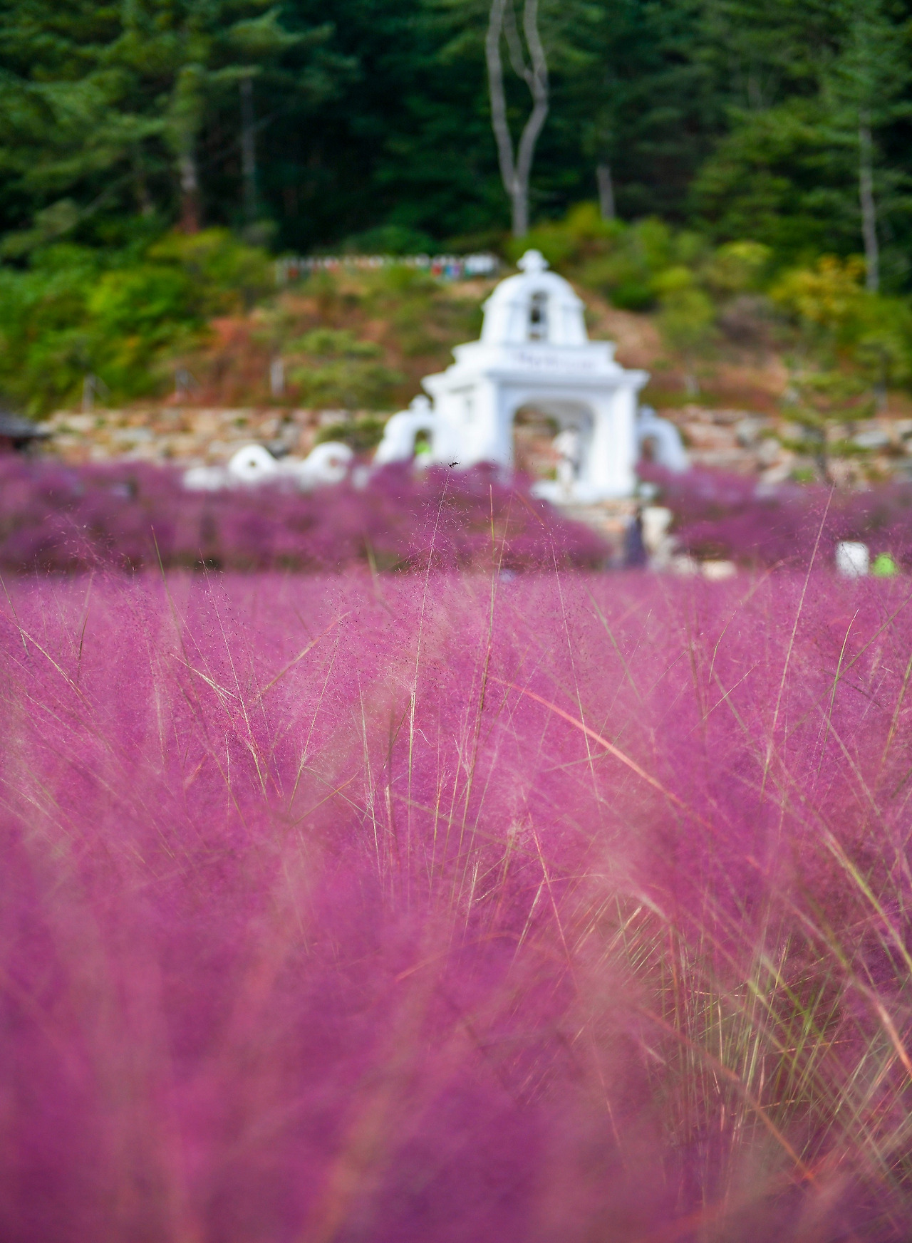 대부분 널찍한 밭에 심겨 있거나 일반 공원이나 알려진 놀이동산에서 핑크 뮬리의 유명세를 알리는데 이곳은 갇힌 산속에 숨겨진 듯 산 아래 허브식물들과 함께 피어나 있다. 생각보다 사람이 많지 않아서 다행인가. 군데군데 사람들이 들어가서 사진 찍느라 바쁘던 다른 곳들에 비해 온전히 핑크뮬리를 바라볼 시간이 주어진 듯해서... 헥헥거리고 올라오느라 흘린 땀을 식히며 핑크뮬리에 멍~.