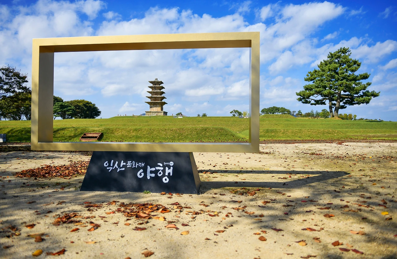 멀리서도 홀로이 오롯한 왕궁리 오층 석탑이 눈에 들어온다. 포토존 프레임 안으로 바라보는 석탑 또한 기품 있다. 오랜 세월 너른 터에 품격을 지키고 있는 모습이다. 왕궁터를 돌아보건대 세련되고 웅장했을 백제 옛 터의 보존으로 이나마 그 풍경 속을 거닐어 본다.