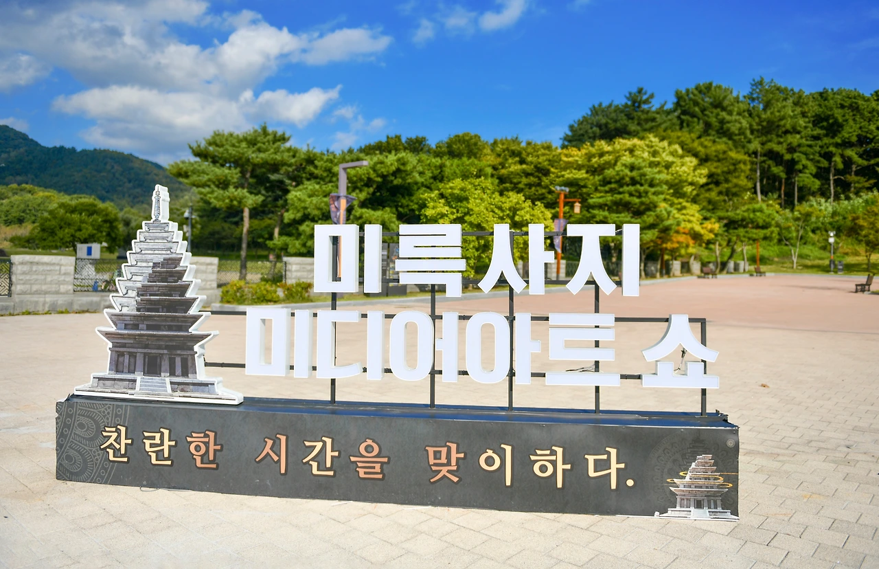 미륵사지 정문에 들기 전에 <미륵사지 미디어 아트쇼>라는 안내판이 보인다. '이게 뭐지' 하면서 보고 있는데 이 지역 주민인 듯 한 분이 지나다가 한 달 전쯤에 진행되었던 행사였다면서 참 볼만했던 쇼였다고 말해준다. 찾아보니 미륵사지 석탑 동. 서쪽에 프로젝션 매핑 및 드론을 이용해서 다양한 빛과 형상을 표현하고 음악을 활용한 종합 미디어쇼로 구현된 행사였다는 것이다.
