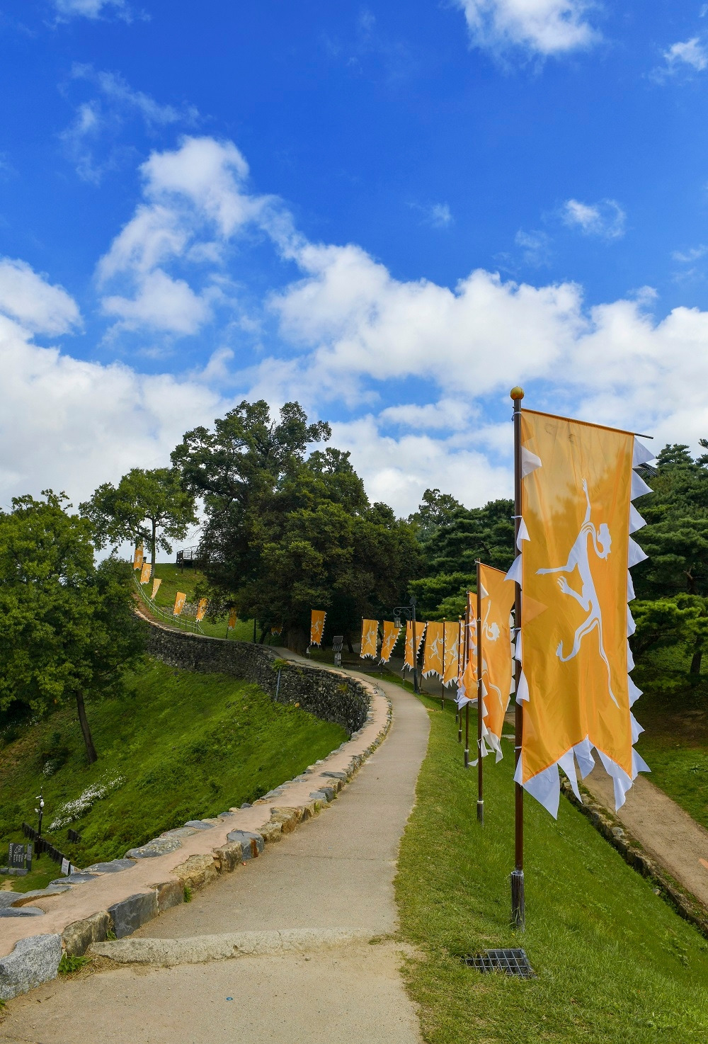 높지 않은 산 위에 능선과 계곡으로 둘러싸인 산성, 송산리 고분군 벽화의 사신도가 그려진 깃발이 맞아준다. 지금은 거의 석성이지만 백제 시대엔 토성이었다고 한다. 삼국시대엔 포곡식으로 축조된 성곽으로 당시엔 웅진성으로 불리었다. 공산성이라 불린 것은 고려시대 이후라 한다. 백제의 수도 웅진을 수비하기 위한 성곽이라지만 성곽길을 걸으며 사방을 돌아보면 곡선미의 성곽이 너무 아름답다.
