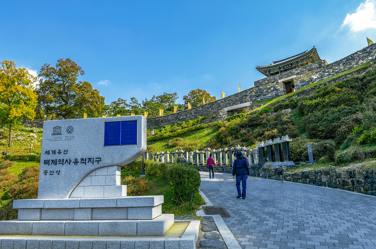 공주라 하면 우선 먼저 떠올리는 공산성이 있다. 공주의 랜드마크라 할 수 있으며 대표적인 고대 성곽으로 유네스코 세계유산으로 선정된 곳이다. 걷기 좋은 성곽길이기도 하다. 오르기 전에 성곽을 올려다보면서 동시에 가을 하늘도 바라보게 된다. 쾌청하다.