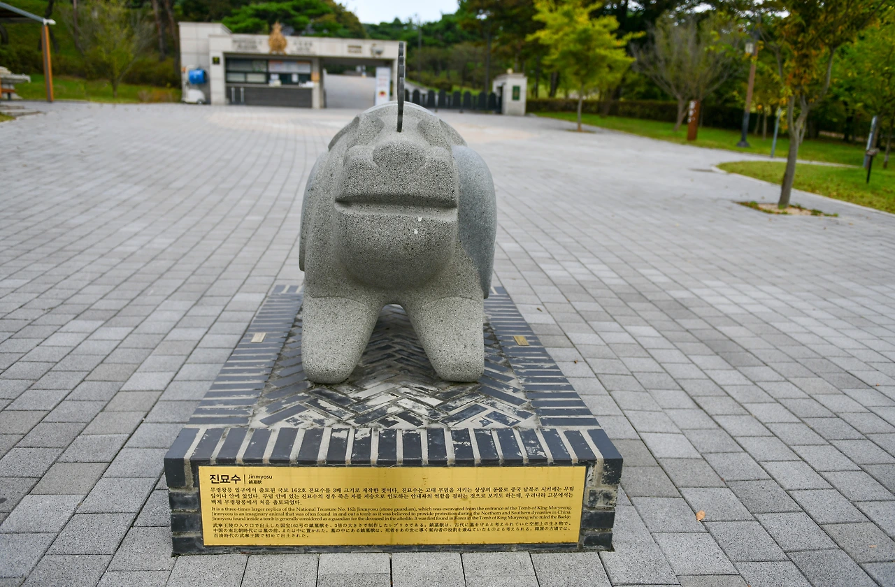 먼저 송산리 고분군으로 가본다. 입구의 진묘수는 무덤을 지키고 죽은 자를 저승으로 안내한다고 한다. 고분 안에도 진묘수가 있다. 공산성도 송산리 고분군도 코로나 이후 무료입장을 실시하고 있다. 그리고 그동안은 일제강점기 때부터 송산리 고분군이라 불리었는데 발굴 50주년인 올해 9월부터는 '공주 무령왕릉과 왕릉원'이라 새로운 이름을 사용하기로 했다고 한다.