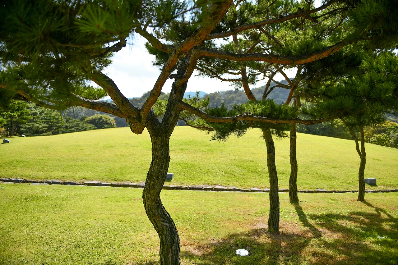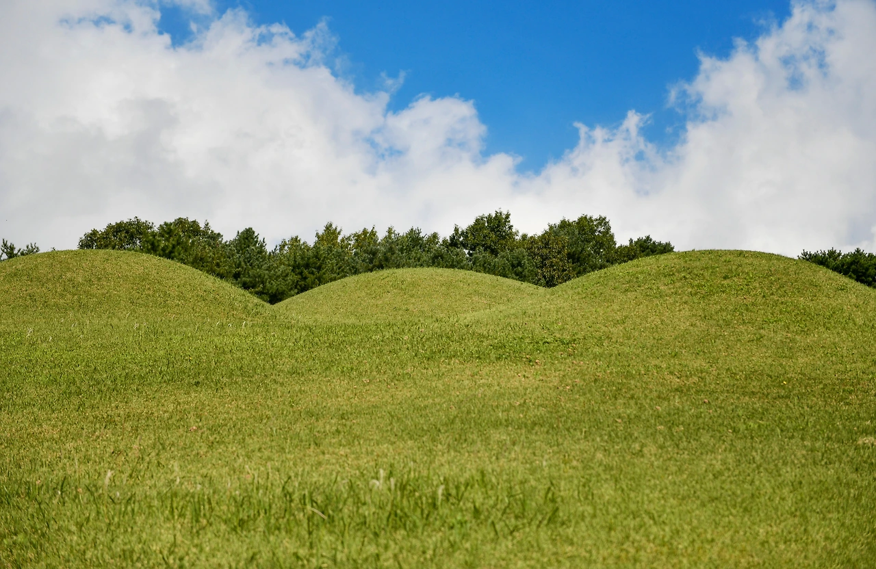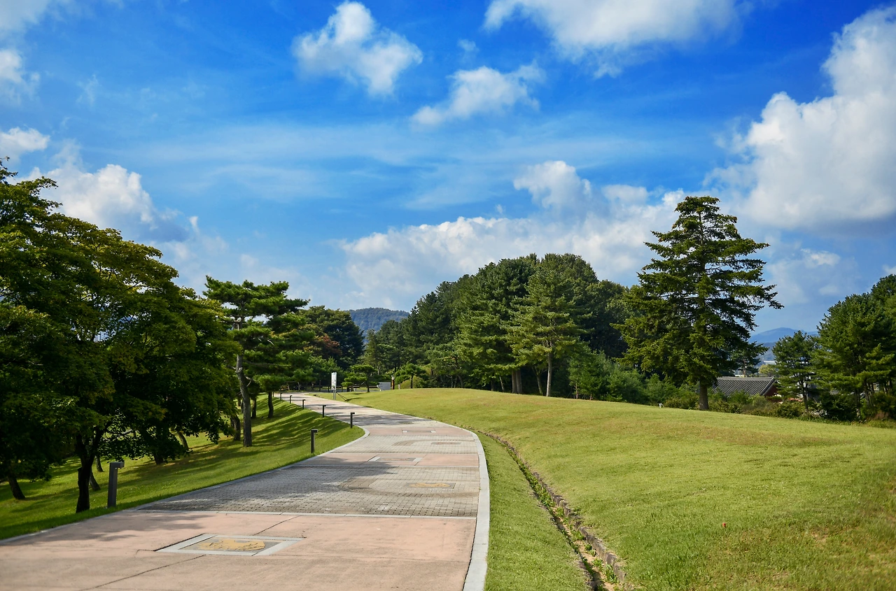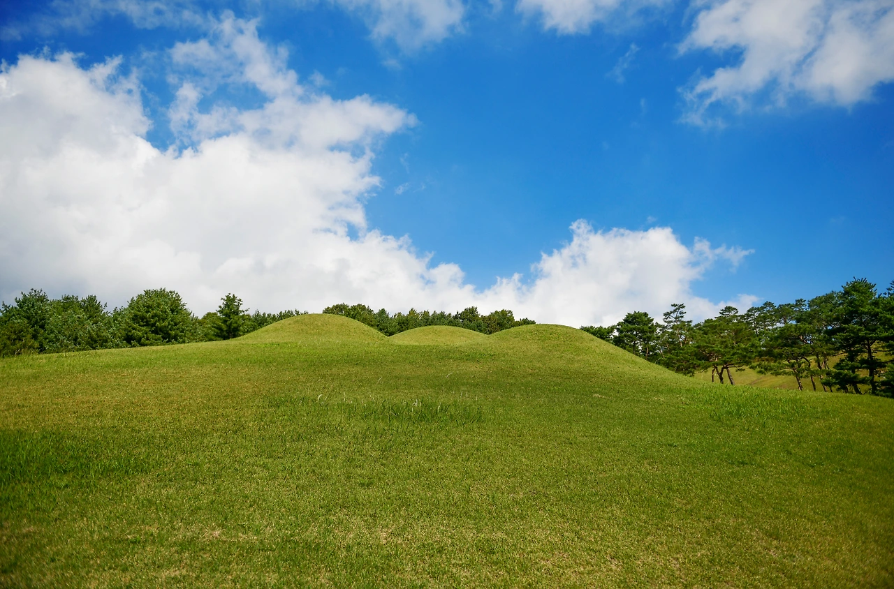 이곳을 다 보고 나가는 문에서 바로 이어지는 송산리 고분군, 7기의 고분이 완만한 듯 봉긋하게 모셔져 있다. 고분 안으로 입장은 안되지만 고분군을 따라 걸으며 그 시절을 상상해 보는 것도 좋을 듯하다. 소나무 군락을 이룬 주변 풍광이 수려하고 탁 트여서 산책하기에도 더없이 좋다.