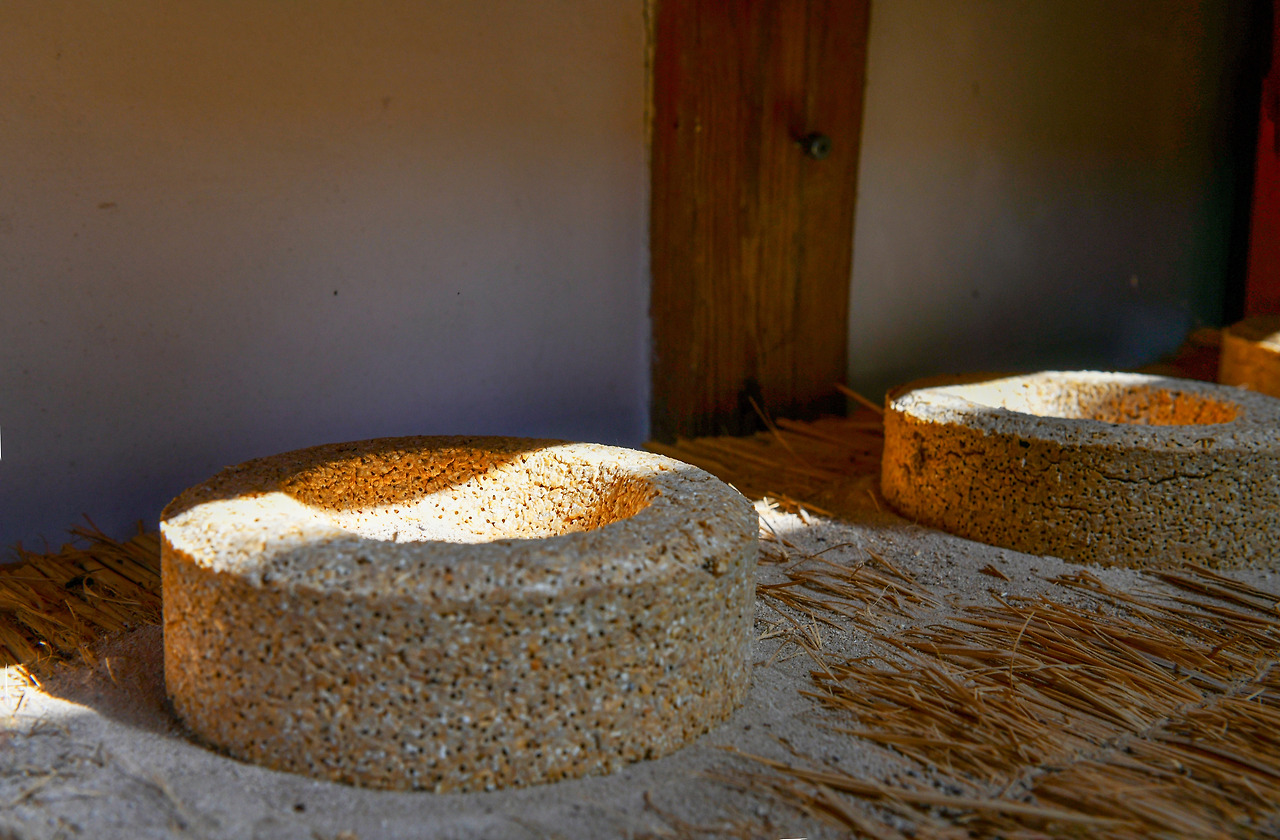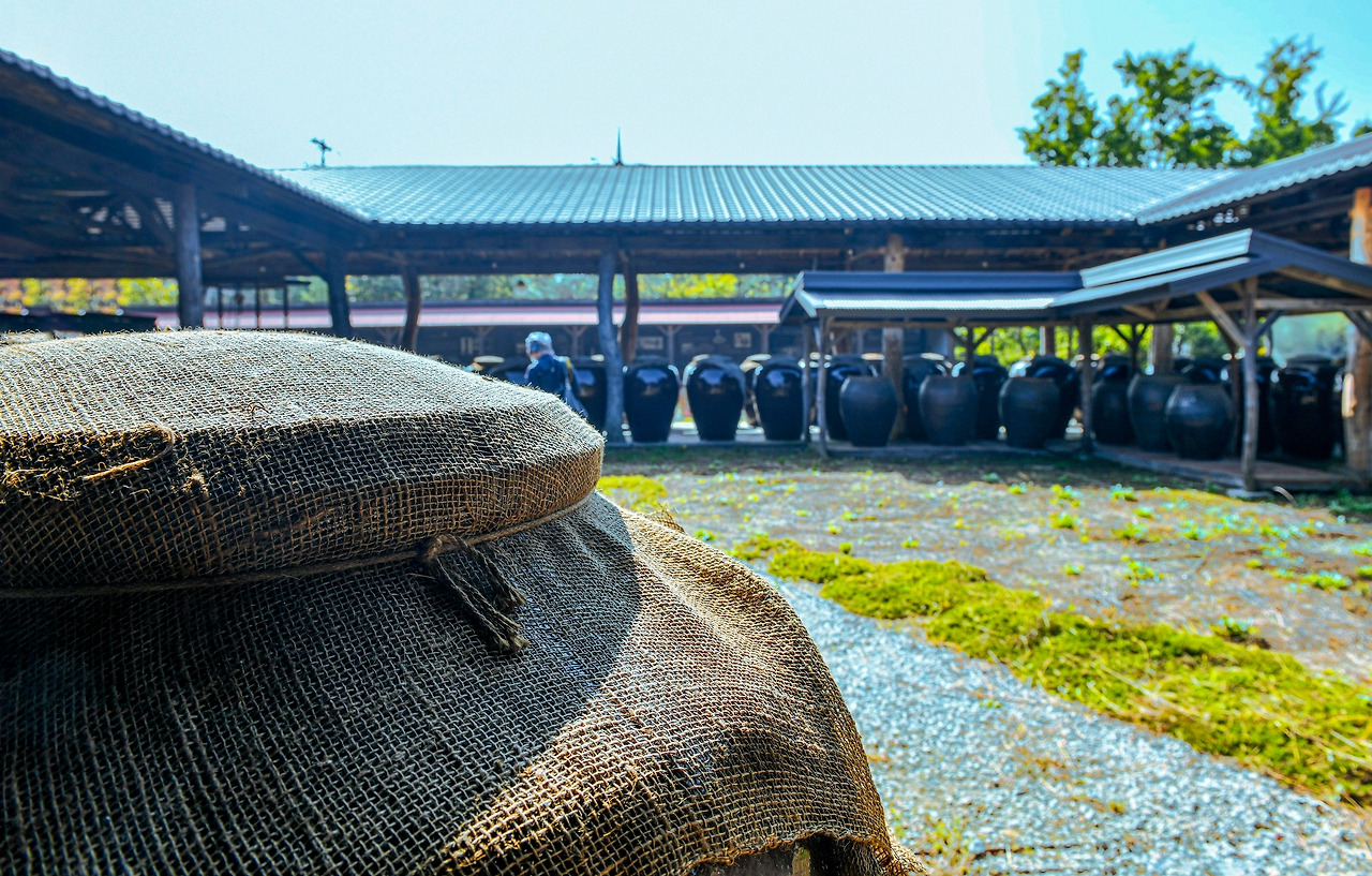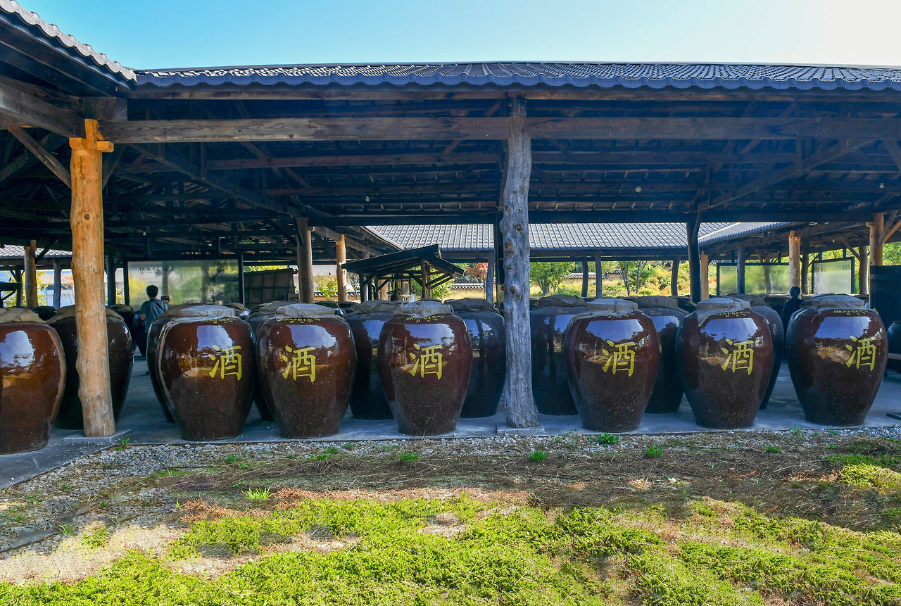 약 4천 평 규모의 산사원에는 이곳의 상징과도 같은 항아리 행렬들이 맞아주고 있다. 전통주들의 숙성 공간 '세월랑'이다. 베보자기로 덮인 뚜껑 아래로 내려앉은 먼지가 햇볕 받아 유난히 선명하다. 희끗한 것은 옹기가 숨 쉬면서 배어 나온 가루 이기도해서 술 발효에 방해되지 않도록 일부러 닦지 않는다는 말도 있다. 온갖 세월을 겪어낸 사람의 연륜을 헤아리듯 숙성되어 가는 술독의 먼지 또한 과정 속의 일부가 되는 듯 얼핏 생각해 본다.