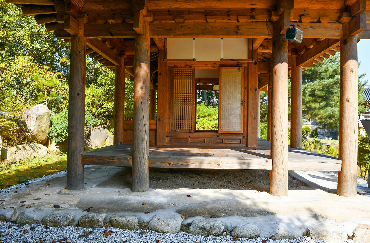 산사원 저편으로 너른 정원이 펼쳐져 있다. 소쇄원의 광풍각을 본뜬 취선각이 숨은 듯 저쪽에 자리 잡고 있다. 느긋하게 산책하다가 멈추고 사방이 열린 취선각에 마냥 앉아있고 싶은 곳이다.