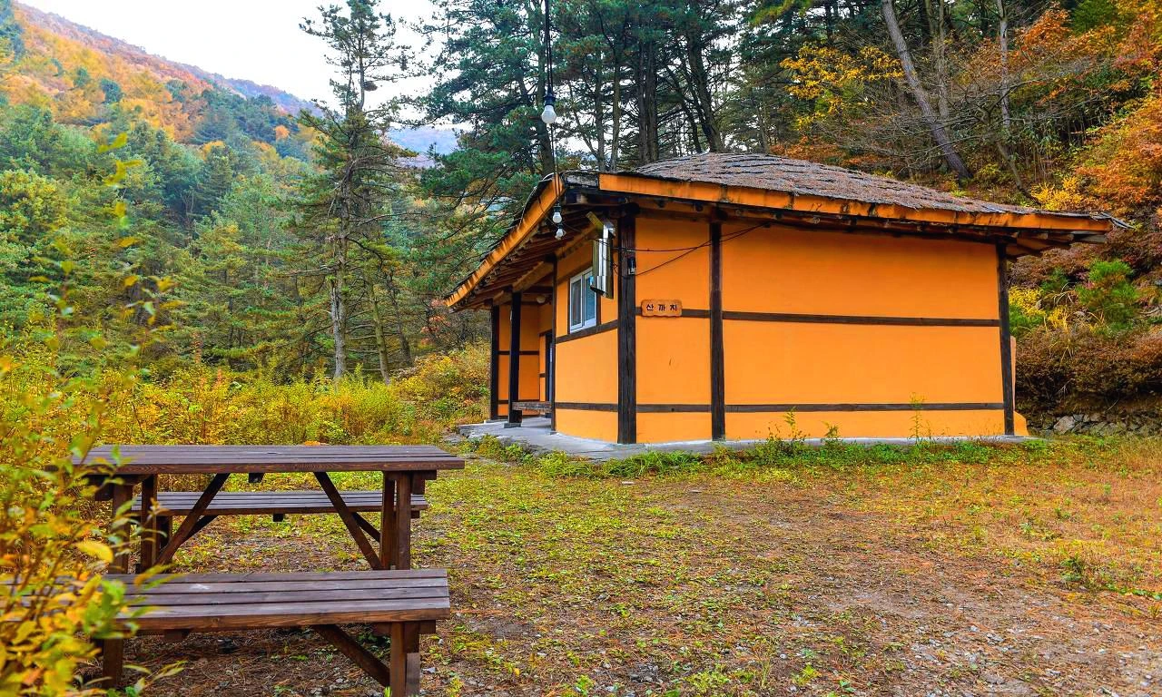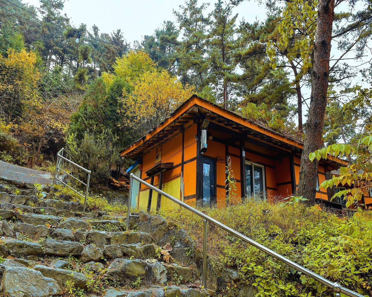 휴양림이 7동이고 단체수련동과 방갈로. 취사장·공동샤워장·급수대가 있다고 한다. 캠핑장도 있다. 예약된 맨 꼭대기인 산까치방으로 오르는 입구에서 보이는 어디서 본듯한 시설물이 눈앞에 있다.