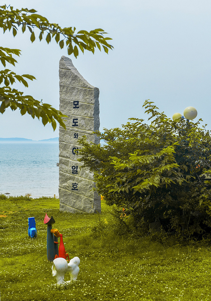 물이 빠진 한낮의 바다 위로 울퉁불퉁 솟은 바위가 잔잔한 파도를 맞고 있다. 조각상 옆에서 까무룩 조을다가 흠칫 놀라며 쏜살같이 내빼는 섬 고양이, 소나무 절벽 위로 올라 멀리 해안선이 그려지는 바다를 내려다본다. 수수하고 원시적인 자연이 만들어 내는 풍경, 진정한 예술은 여기 있는 듯.