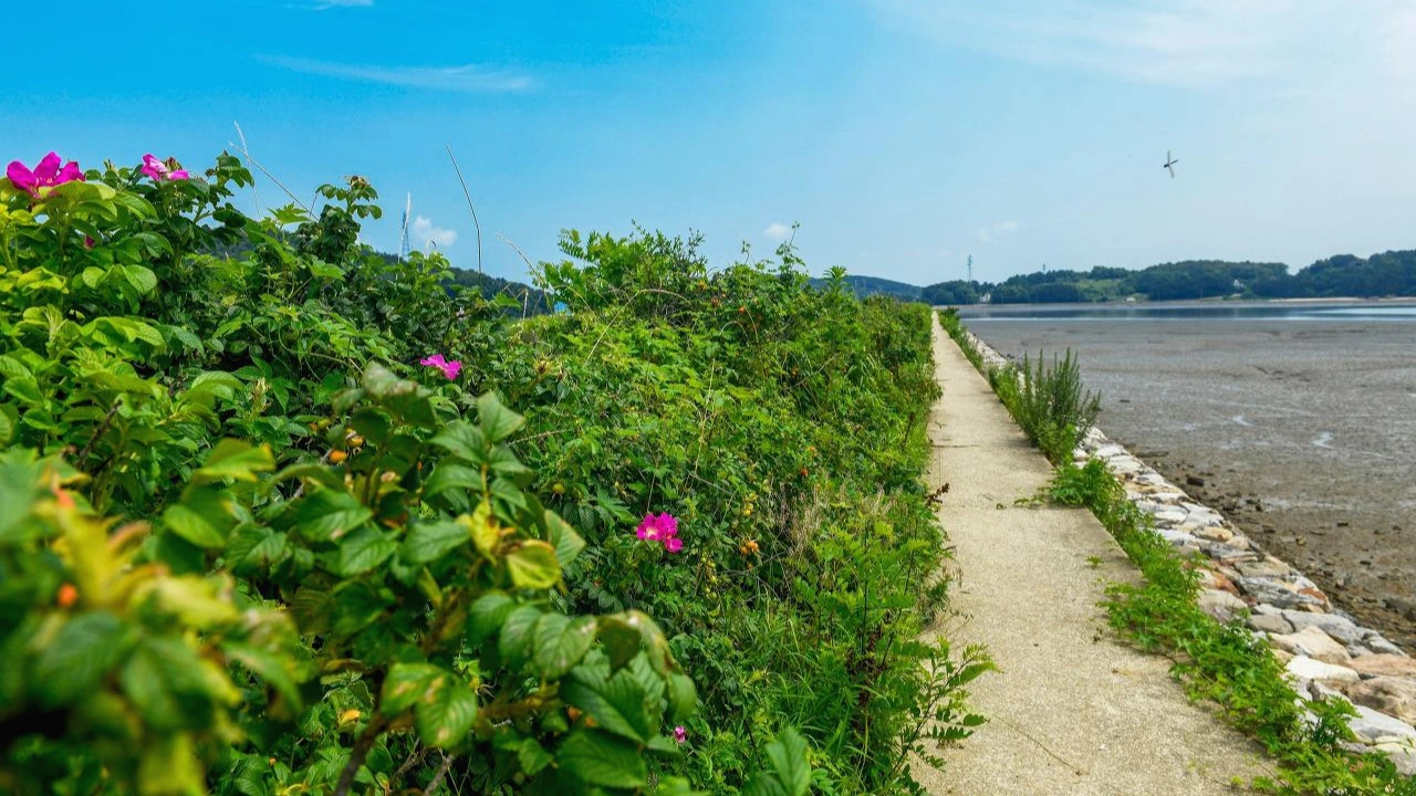 신도와 시도를 잇는 연도교를 건너고, 이제는 시도와 모도를 잇는 다리를 건넌다. 그리고 모도 끄트머리 배미꾸미 해변으로 들기 전 박주기 해변 방향의 길 위에서 우선멈춤. 제방 둑에 1.4km의 해당화 꽃길이 기다랗게 펼쳐진 모습이 가을볕에 아득하다. 봄과 여름 사이 해당화 꽃이 필 무렵이면 트래킹이나 자전거 여행 코스의 백미로 꼽히는 길이다.