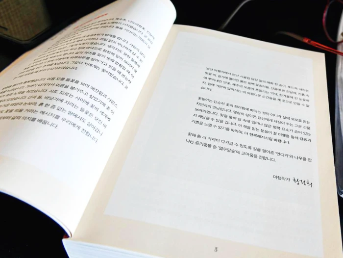 꽃놀이는 단순히 꽃의 화려함에 빠지는 것이 아니라 삶에 위로를 받는 자연과의 만남입니다. 열심히 살아온 당신에게 세상이 주는 고운 선물 보따리입니다. 꽃을 통해 삶 속에 얼마나 많은 행복 요소가 숨어 있는지 깨달을 수 있을 겁니다. 이 책을 읽는 분들이 꽃 여행을 통해 감동과 기쁨을 느낄 수 있기를 바라며, 더 행복해지시길 바랍니다.