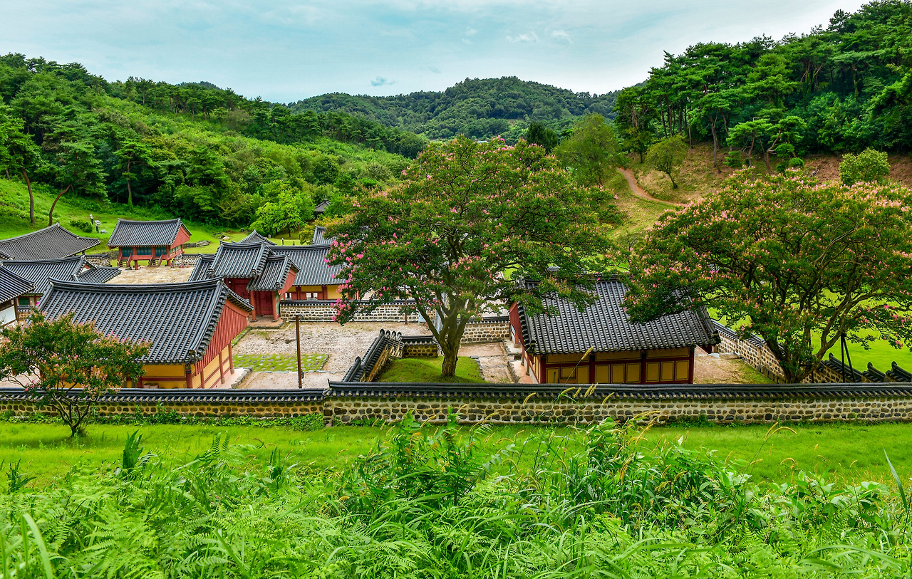 바로 이곳 영당 뒤편에 해마다 여름이면 두 그루의 노거수에서 배롱꽃을 풍성하게 피워 올린다. 전통 건축의 지붕 위로 어우러진 배롱꽃무리가 몽글몽글하다. 지난밤의 비바람으로 이미 많은 꽃이 떨어졌지만 배롱나무의 강한 생명력은 계속 이어진다.