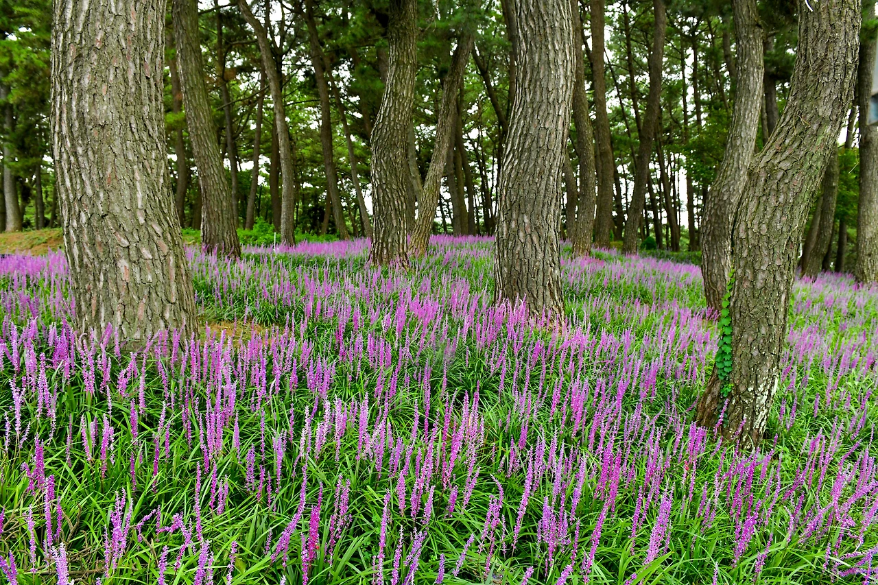 다시 꽃구경, 장항 쪽으로 달리다 보면 장항 송림 산림욕장이 나타난다. 방풍림만으로도 압도한다. 수령 50년 이상의 해송이 하늘을 가려 시원하기 이를 데 없다. 여름이 끝날 무렵이면 해송 아래 온통 보랏빛 맥문동 물결이다. 이곳에 오토캠핑장이 있어서 공기 밀도 걱정 없이 휴식하고 있는 사람들의 모습이 여유롭다.