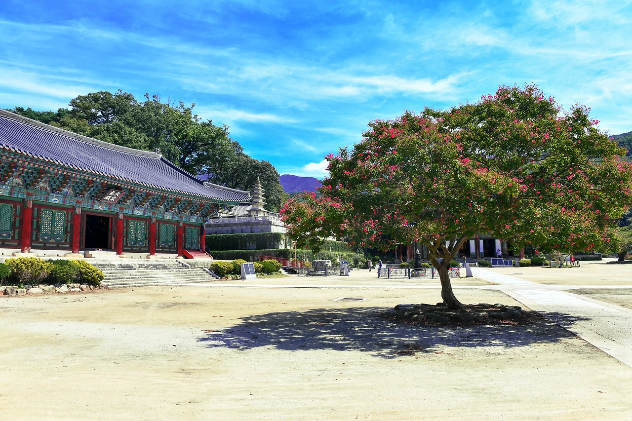 정면의 대적광전 앞으로 아직도 배롱나무가 꽃을 피우고 있다. 오른쪽에 위치한 미륵전 안을 들여다보면 미륵불상의 크기에 놀란다. 미륵전은 미래에서 오실 부처님이란 뜻이다. 둘러보는 건물마다 창살에 새겨진 단청문양이 이리도 예쁘구나... 미륵전을 지나 나오는 계단 주변의 담장 아래에 붉은 꽃무릇이 한창이다.