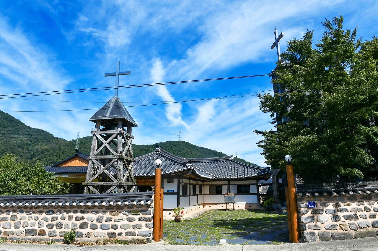 금산교회는 우리나라에서 보기 드문 ㄱ자형 교회다. 1908년에 세워진 한옥형 성당으로 “ㄱ” 구조의 이유는 남녀 구별이 유별하던 당시의 관습으로 남녀 각각 떨어져 예배를 보도록 되어 있는 것이다. 유교문화를 수용하면서 교회의 본성을 유지한 모습이다. 칸막이 커튼이나 남녀 공간을 구분한 천정의 글씨가 남녀유별을 보여준다.