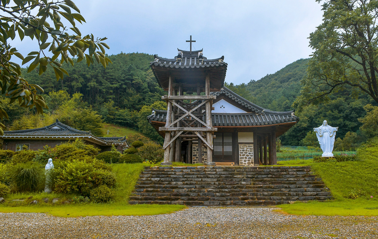 완주를 떠나기 전 또 한 번의 평온한 시간을 맞는다. 구불구불 깊고 깊은 마을길을 따라 한참을 들어간 시골마을 저편 산 아래 새하얀 예수상이 눈에 들어온다. 마당에 들어서면 산속에 자리한 되재 성당 주변으로 아름다운 능선의 산과 푸른 하늘이 마냥 평화롭다. 한옥 지붕 아래 작은 마루와 살짝 휘인 처마가 목구조 단층 성당의 멋을 돋보이게 한다.