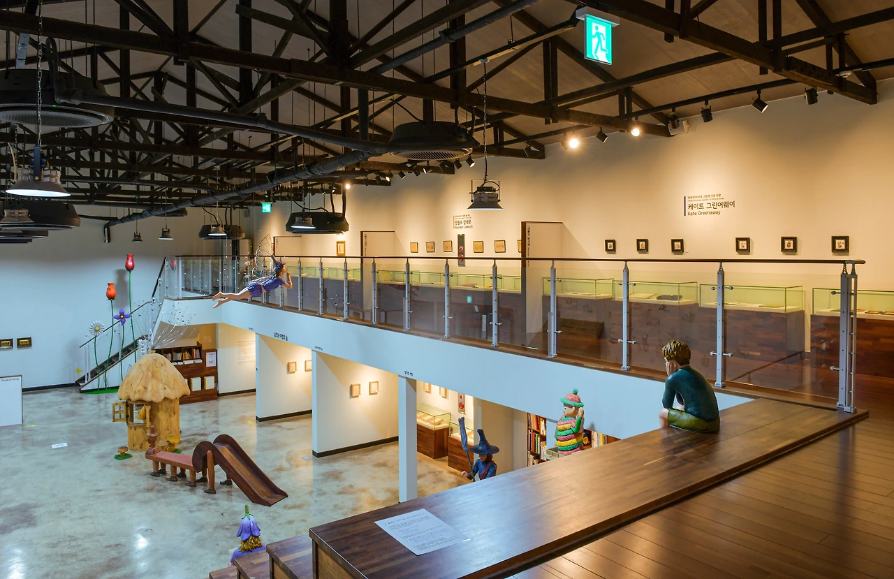 그림책미술관답게 창문 디테일도 살아 숨 쉬듯 알록달록 귀엽고 생동감을 준다. 요정과 마법 지팡이와 같은 동화 속 이야기와 연관된 조형물들, 책을 읽을 만한 계단식 의자, 미끄럼틀 벤치, 그림책이라고 하여 아이들과 가볼 만한 곳이라는 오해는 금물이다. 1층과 2층을 오르내리면서 아이 어른 할 것 없이 행복한 시간을 보낼 만한 곳이다. 전국에서 유일한 그림책 미술관이라 하니. 그리고 세계문화사적 가치가 높은 그림책과 원화작품들이 있으므로 관심분야라면 꼭 들러보길 권한다. 규모에 비해 공간의 매력이 알차다.