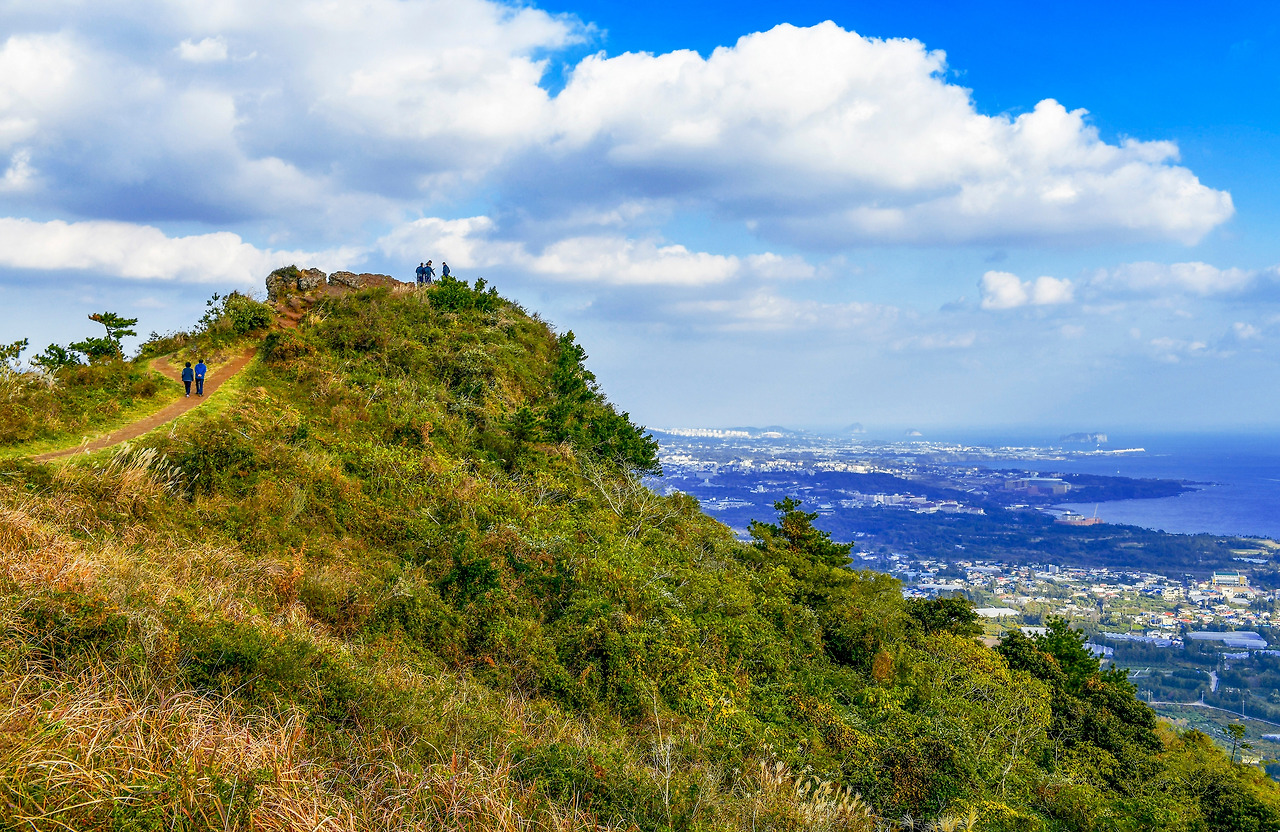 군산오름은 제주의 동쪽에서 이어지는 남서쪽에 위치해 있다. 제주 여행 중이라면 한 번쯤 오름에 올라볼 생각을 하게 된다. 시간을 많이 내야 하거나 오래 걷기가 쉽지 않은 사람이라면 군산 오름이 딱 좋다. 자동차로 오름 중턱까지 갈 수 있는데 주차장은 협소하다. 특히 좁은 언덕길과 후진 등의 난이도가 높은 길이어서 운전이 능숙한 사람이면 좋을 듯하다. 차에서 내려 10여 분 정도 가파른 길을 올라야 하고 다시 오름 끝까지는 완만한 편이다. 올레길 9코스이기도 하다.