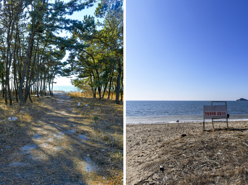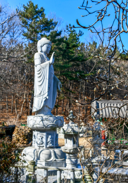 미미한 기척조차 들리지 않는 고요한 사찰이다. 대웅전을 지나 돌계단을 오르면 우뚝 선 부처님 입상이 발걸음을 멈추게 한다. 입상 옆의 작은 전각은 문이 닫혀 있다. 코로나 이후 요즘은 어딜 가든 문이 닫혀있는 곳을 쉽게 본다. 입상 뒤편의 산을 오르면 숲을 통해서 바다를 바라볼 수 있다. 숲을 돌아보고 내려오다 보니 부처님 입상 옆으로 늘어진 나무줄기에 싹 틔울 준비를 하는 봉오리들이 매달려있는 게 보인다. 온 누리에 따뜻한 봄볕이 내리고 푸릇푸릇 새싹을 틔울 무렵이면 닫힌 문도 열리고 사람의 마음도 활짝 열리길 기대해 본다.