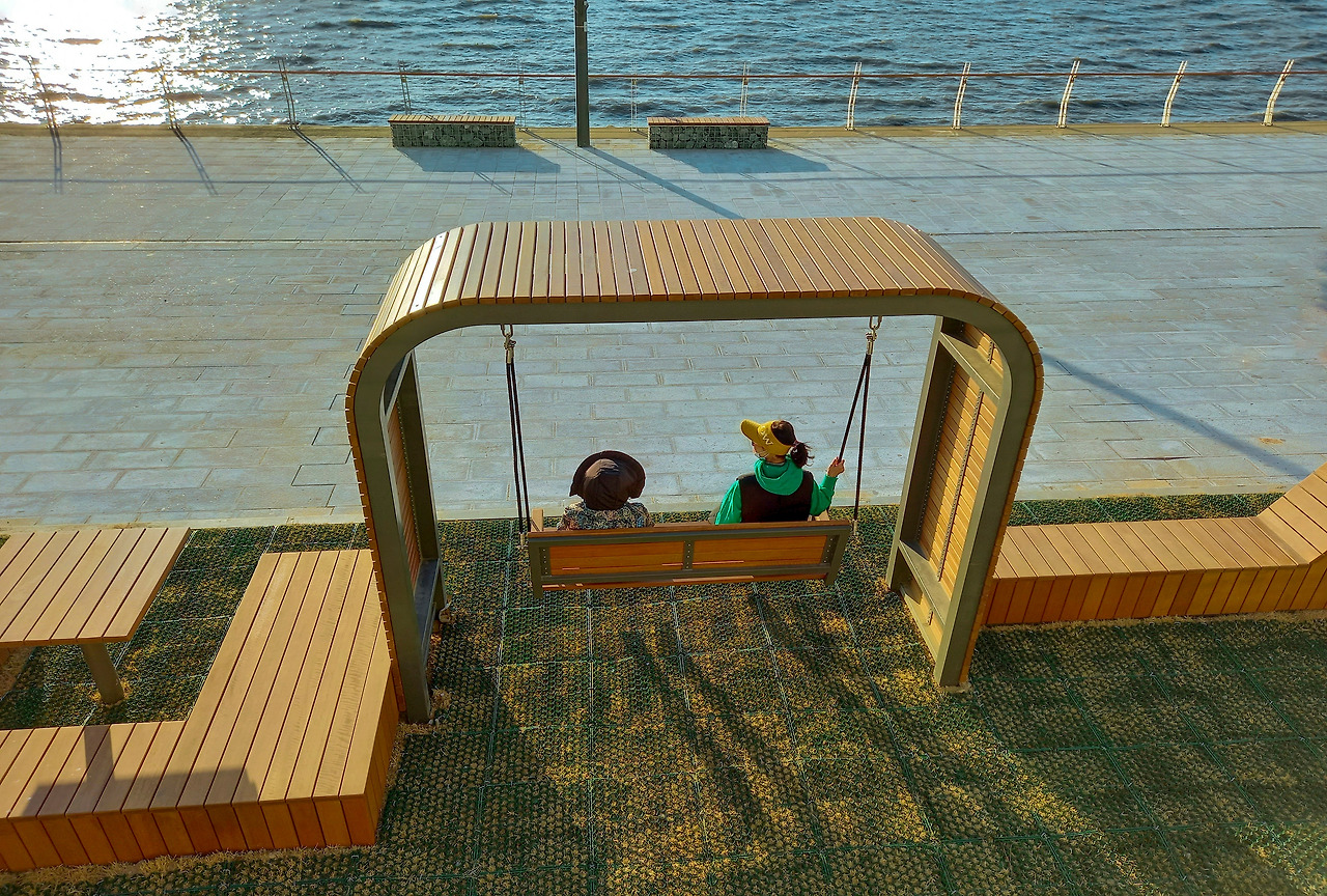 바다를 바라보며 긴 산책길을 걷다 보면 이곳을 찾는 이들을 위한 서비스 공간을 마련한 노력이 엿보인다. 2층으로 구성되어 있는 수변공원이다. 쉼터 데크와 모양의 변화를 준 흔들의자에 앉아서 유유히 바다를 바라보는 이들의 여유로움도 보기 좋다. 길게 이어진 선베드 스타일의 벤치는 여름에 많이 많이 이용할 것 같은 생각이 들었다. 피크닉 하기 좋은 테이블 의자도 곳곳에 비치되어 있다. 따뜻해지면 커피 한잔 담아서 책 한 권 들고 나와 봄볕아래 한없이 앉아 있어도 좋을 듯하다.
